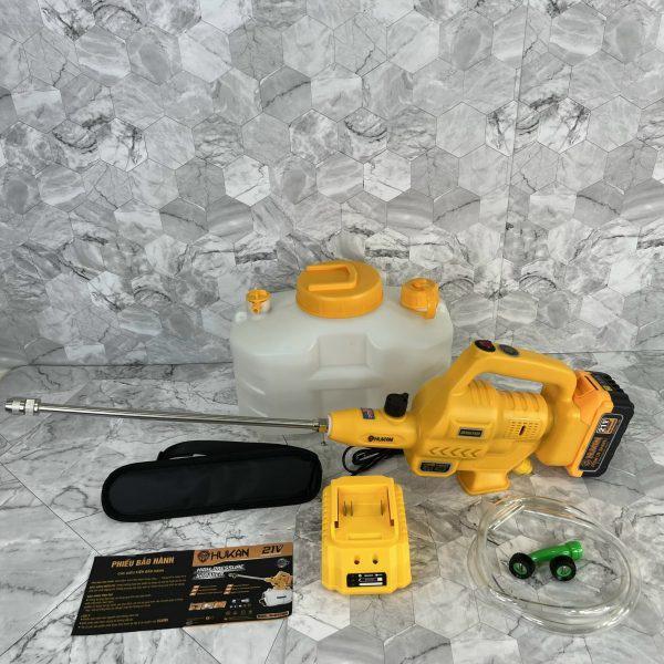– Máy phun xịt tưới cây được thiết kế sử dụng pin chân phổ thông 21 với bình chứa 6L tích hợp gắn trên thân máy.