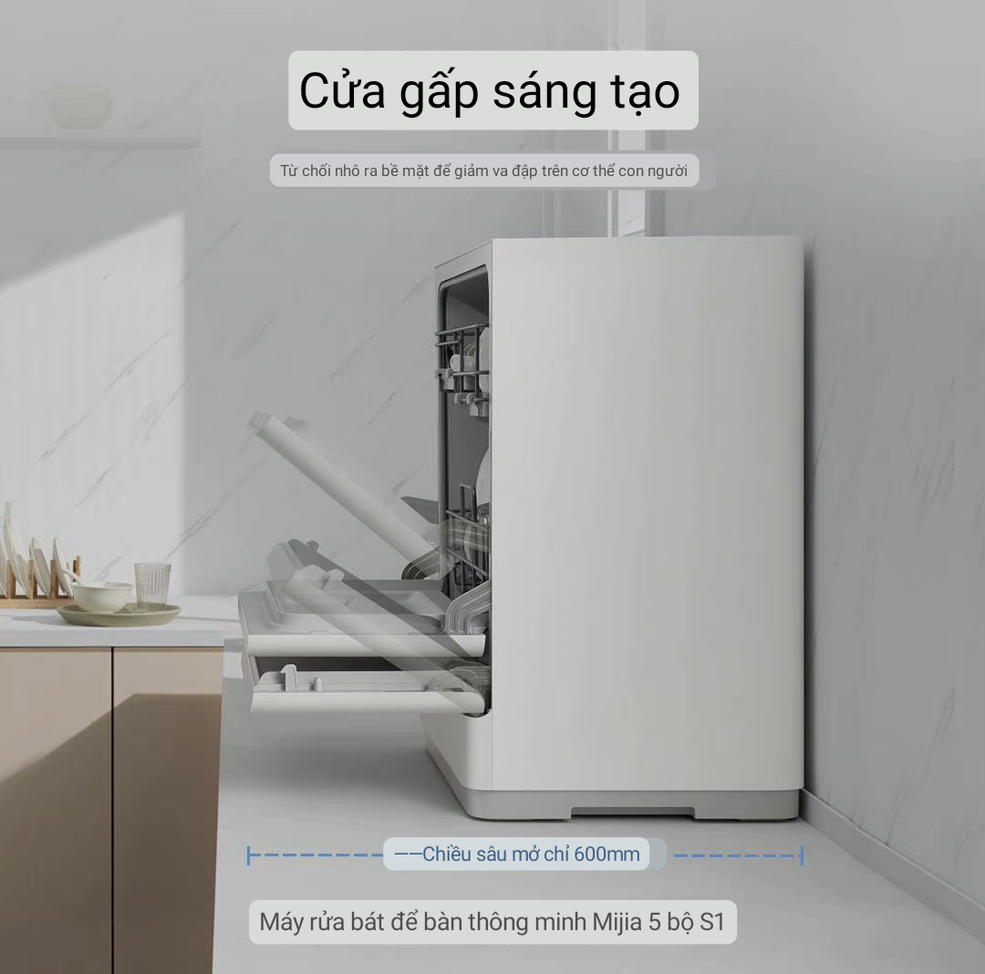 Máy rửa bát để bàn thông minh Mijia S1 có chiều sâu thân máy chỉ là 350mm và chiều rộng thân máy là 550mm, chiếm khoảng 0,19 mét vuông mặt bàn; nó có thể rửa 5 bộ đồ ăn tiêu chuẩn cùng một lúc, tổng cộng là 39 mảnh của bộ đồ ăn .