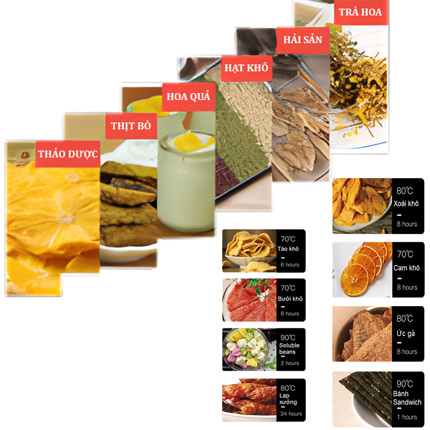 - Nâng cấp động cơ quạt mạnh hơn giúp sấy khô nhanh hơn Sấy đa dạng các loại hoa quả, thực phẩm