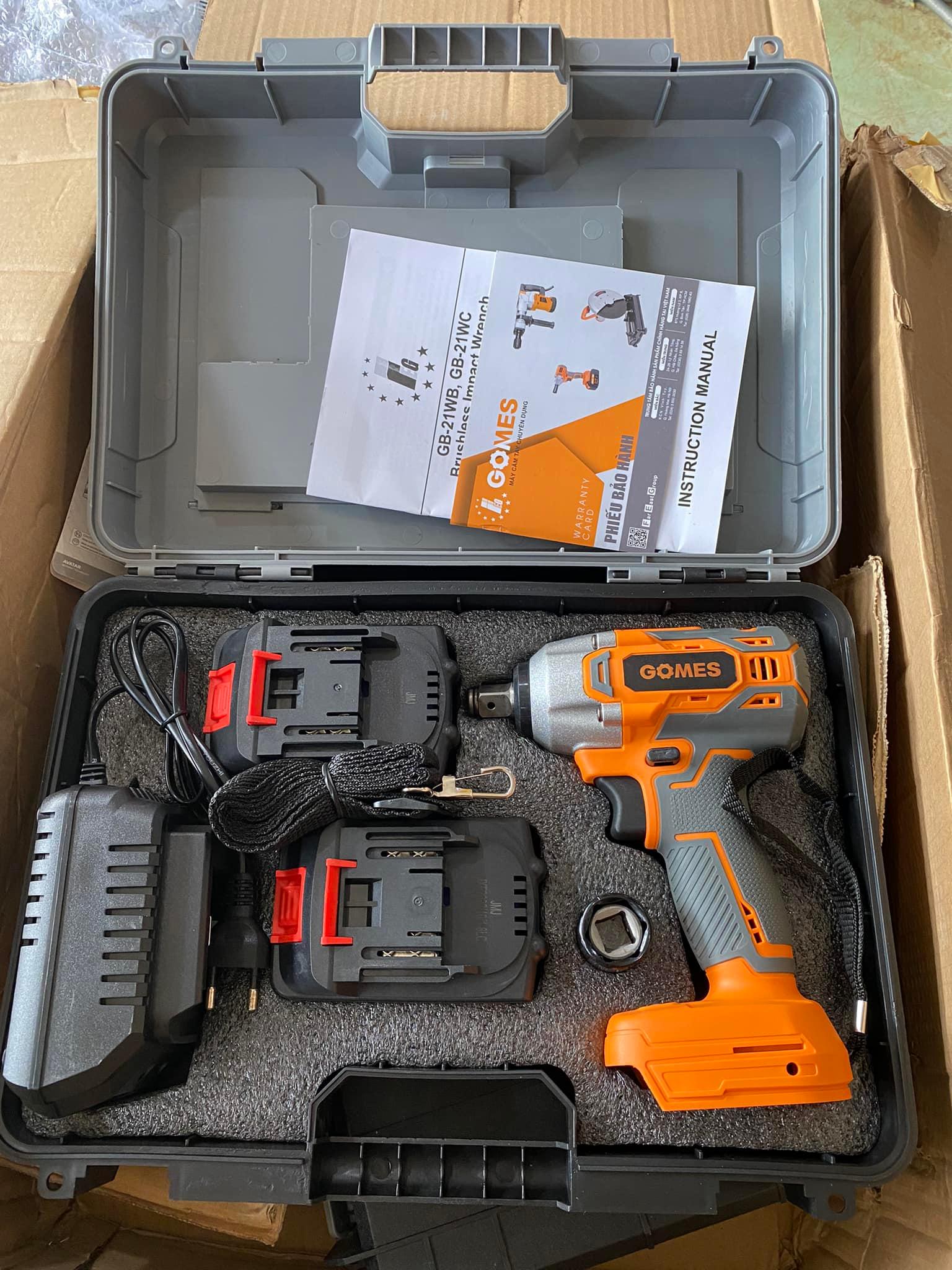 Thông số kĩ thuật -Mã sản phẩm: GB-21WB -Nhà sản xuất: GOMES -Xuất xứ: Trung Quốc -Loại máy Dùng pin -Tốc độ không tải 210 vòng/phút, 0 - 2.500 vòng/phút -Điện thế pin 21V -Loại Pin Lion 21V/4.0Ah -Đầu siết 1/2 inch -Lực siết tối đa 300Nm
