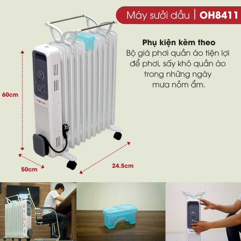 Máy sưởi dầu FUJIHOME OH8411 có thể đặt trong phòng bếp, phòng khách, phòng ngủ phòng đọc sách, vui chơi giải trí, máy được làm nóng bởi các tấm sưởi và tỏa nhiệt độ ra ngoài, nhiệt độ từ lạnh chuyển sang ấm dần, đem đến cảm giác ấm áp và rất dễ chịu.