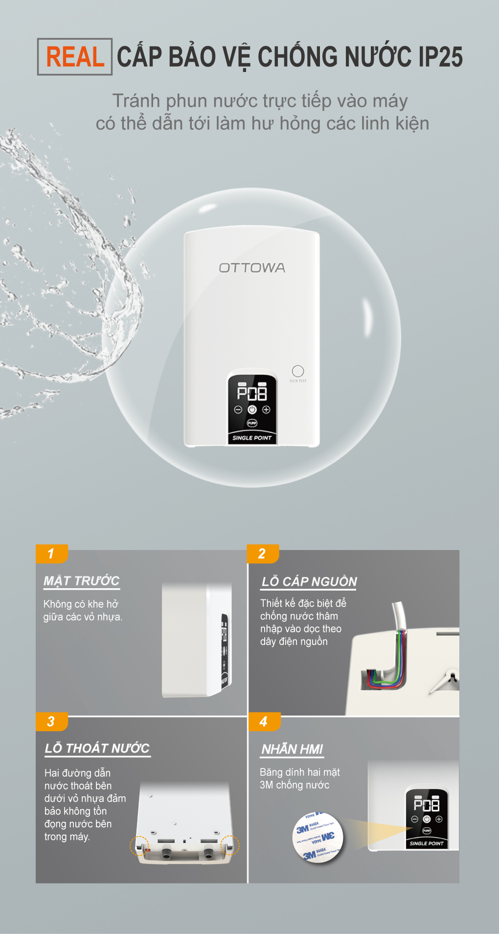 ● Máy được tích hợp phần mềm điều khiển thông minh, với 16 chương trình lựa chọn, nhiệt nhiệt độ được điều chỉnh mượt mà hơn ● Điều khiển nút bấm vật lý dễ sử dụng: Phím bấm bền hơn, tin cậy hơn, chịu được điều kiện ẩm ướt trong nhà tắm. Khắc phục nhược điểm núm vặn dễ bị ảnh hưởng bởi độ ẩm và bụi ● Máy được trang bị bơm DC siêu êm, gia tăng áp lực đáng kể, rất thích hợp cho các gia đình có áp suất nước đầu vào yếu ● Công nghệ chống giật RCD an toàn tuyệt đối. ● Bầu đun lớn hơn, nhiệt độ ổn định hơn. Tránh sốc nhiệt: Gia nhiệt tốt hơn, không kén điện, cho nước nóng nhiều hơn ● Máy được trang bị sen tăn áp, tắm sảng khoái hơn: Gia tăng đáng kể áp lực, tắm có cảm giác sảng khoái hơn ● Đạt cấp độ bảo vệ IP25 thật ● Máy được sản xuất tại Việt Nam BỘ PHỤ KIỆN TIÊU CHUẨN