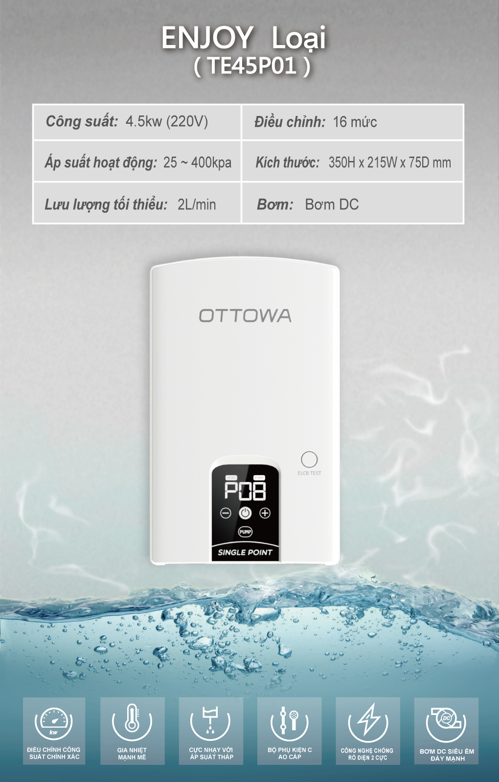 ✨Máy tắm nước nóng OTTOWA TE45P01 - Hàng chính hãng - Có bơm