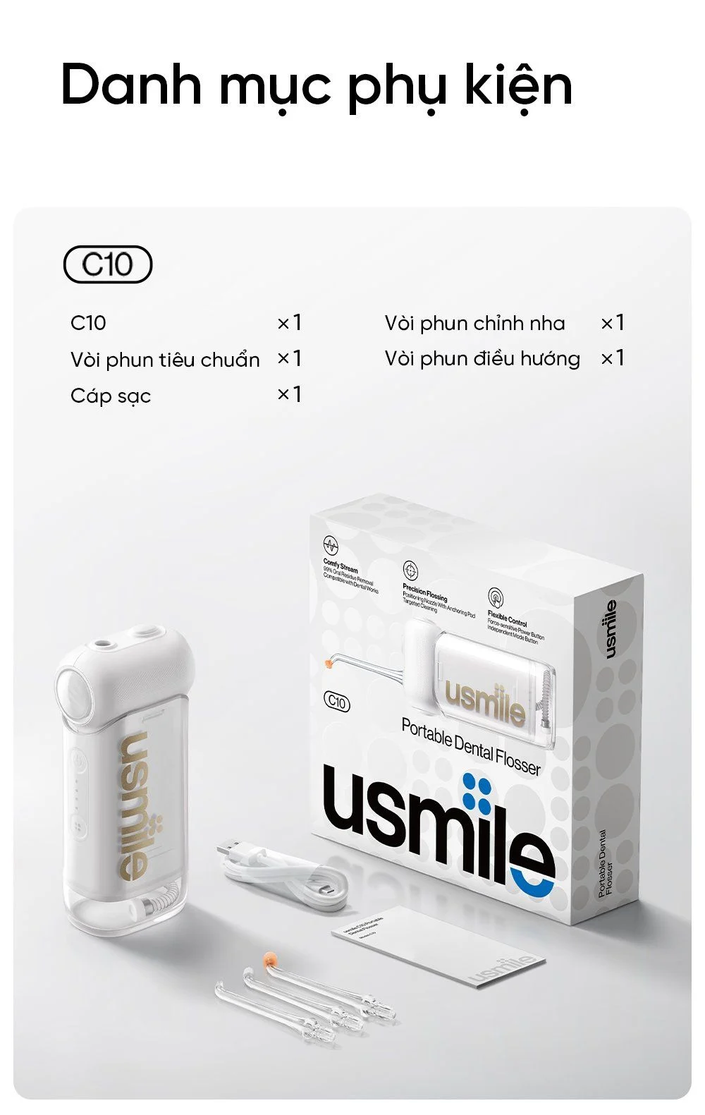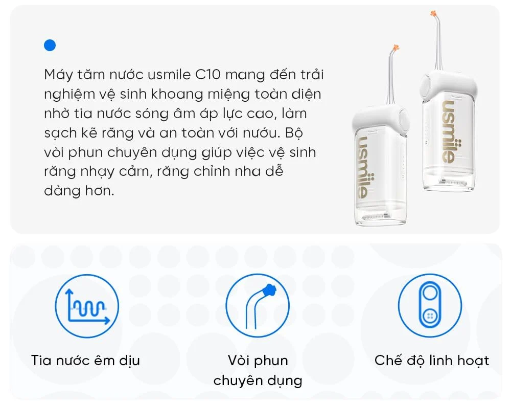 Với usmile C10, bạn không chỉ có được sự sạch sẽ và sức khỏe cho răng miệng mà còn trải nghiệm sự tiện lợi và thoải mái từ việc chăm sóc răng miệng hàng ngày.