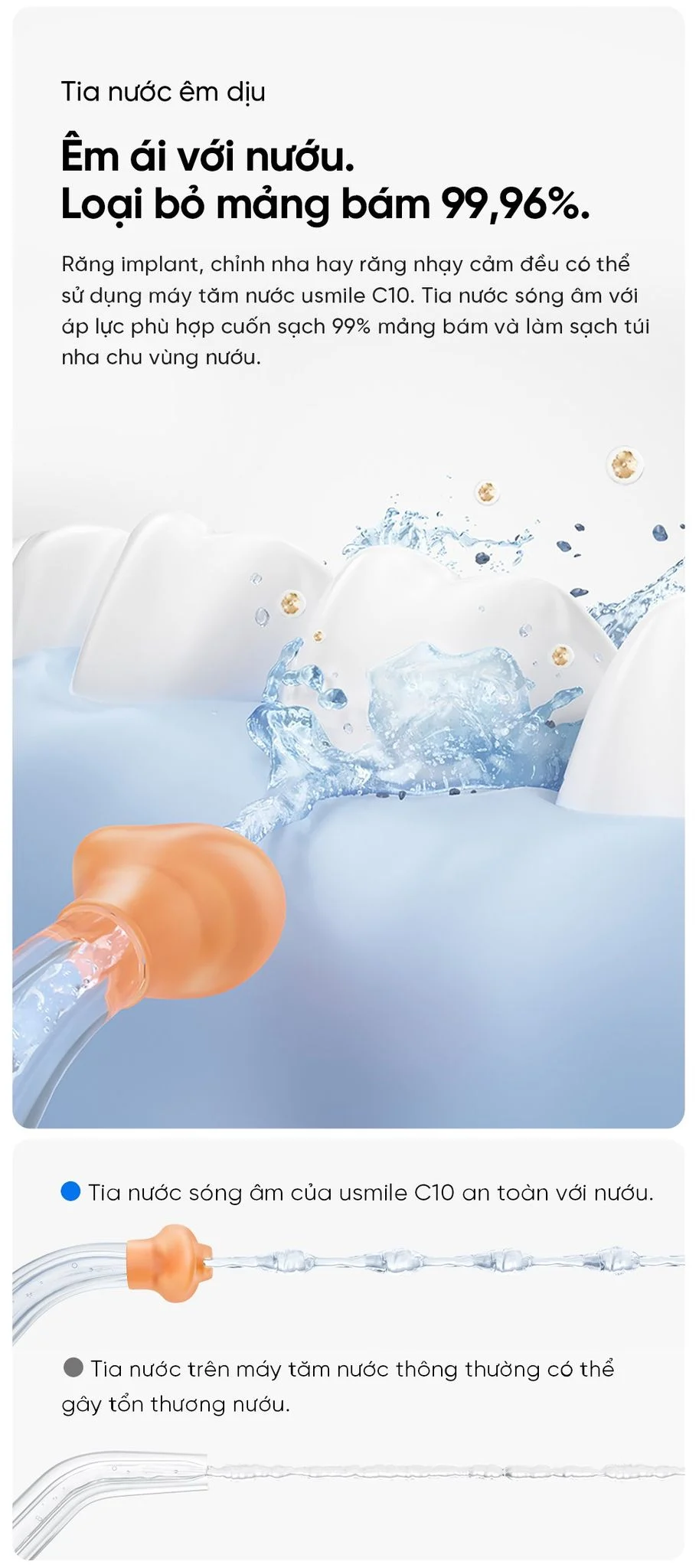 Usimle C10 sử dụng công nghệ sóng âm tiên tiến tạo ra tia nước với các bọt khí li ti làm sạch kẽ răng và toàn bộ khoang miệng. Áp lực tia nước tăng dần trong 3 giây, an toàn cho nướu và răng nhạy cảm, giúp loại bỏ mảng bám và vi khuẩn một cách hiệu quả.
