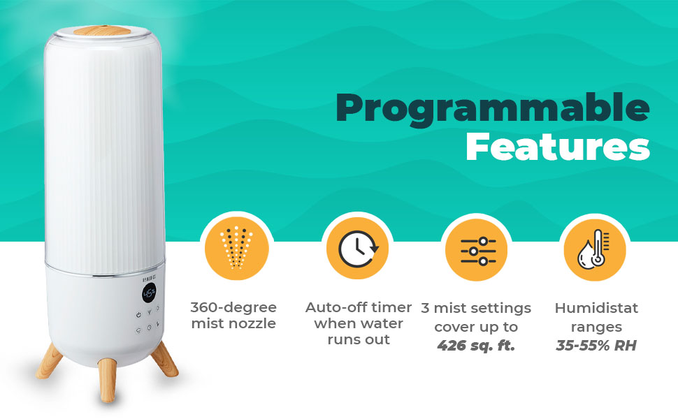 Cung cấp độ ẩm lí tưởng cho sức khỏe Phù hợp với các không gian lên đến 210m² Kết hợp hoàn hảo với điều hòa nhiệt độ Bảo vệ đồ nội thất, nhạc cụ, các