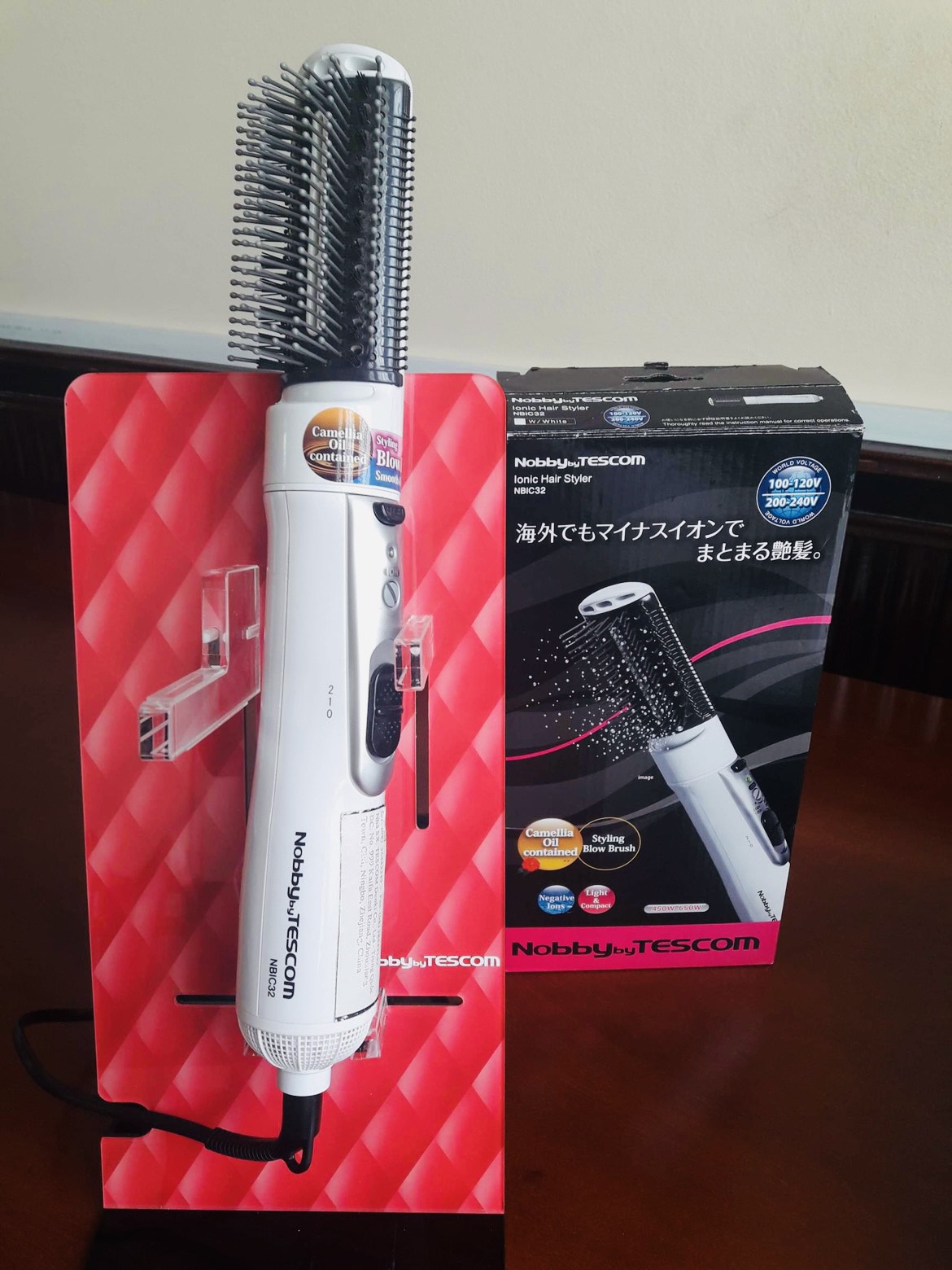 - Thời gian sử dụng tinh dầu hoa trà Nhật: 1,5 năm (3 lần chải mỗi ngày). Công dụng của tinh dầu hoa trà là giúp mái tóc sau khi tạo kiểu và chải xong được bóng và giữ nếp lâu hơn. Sau thời gian này, máy chỉ dùng chức năng chính là bổ sung ion âm. ▼ Thông số kỹ thuật Model (mã hàng) : NBIC32 Thương hiệu : TESCOM Công dụng : NBIC32 là lược sấy tạo kiểu tóc có bổ sung ion âm và tinh dầu hoa trà Nhật Chất liệu răng lược : Răng lược bằng nhựa silicon mềm đầu tròn giúp bảo vệ da đầu khỏi trầy xước. Thư giãn khi chải đầu. Trọng lượng : Siêu nhẹ chỉ 335 gram, tay cầm gập gọn dễ dàng Nguồn điện : 100V đến 240V ; 50.60Hz(Việt Nam dùng điện 220V) Công suất : 450W - 650W Chế độ gió sấy : Gió nóng - gió ấm (chỉ 01 nút gạt 1-2 mức). Đặc biệt dùng để tạo tóc cúp hoặc vừa sấy vừa tạo kiểu xoăn nhẹ Xuất xứ thương hiệu : Nhật Bản Sản xuất tại : Tescom Denki – Trung Quốc Bảo hành: Có thẻ bảo hành kèm theo máy. Báo hành 01 năm. ▼Thương hiệu TESCOM TESCOM thành lập 1960 là thương hiệu máy sấy tóc bổ sung Collagen Nano ion âm cao cấp từ Nhật Bản. TESCOM chính là công ty tiên phong ra mắt sản phẩm thiết bị chăm sóc tóc và chăm sóc da mặt ứng dụng công nghệ bổ sung ion âm đầu tiên trên thế giới. TESCOM giúp bạn chăm sóc làn da đẹp hơn và sáng tạo ra những kiểu tóc phù hợp với đặc tính mái tóc của bạn. Hiện nay, TESCOM cũng đi đầu trong lĩnh vực kết hợp bổ sung Collagen - Platinum - Nano ion âm và tinh dầu hoa trà Nhật vào các sản phẩm chăm sóc tóc (máy sấy tóc, máy tạo kiểu tóc) tại Nhật Bản. Bổ sung Collagen, bổ sung Nano ion âm trong sản phẩm TESCOM sẽ bảo vệ mái tóc khỏi các tác nhân tĩnh điện và làm mái tóc của bạn mềm mại đẹp tự nhiên.