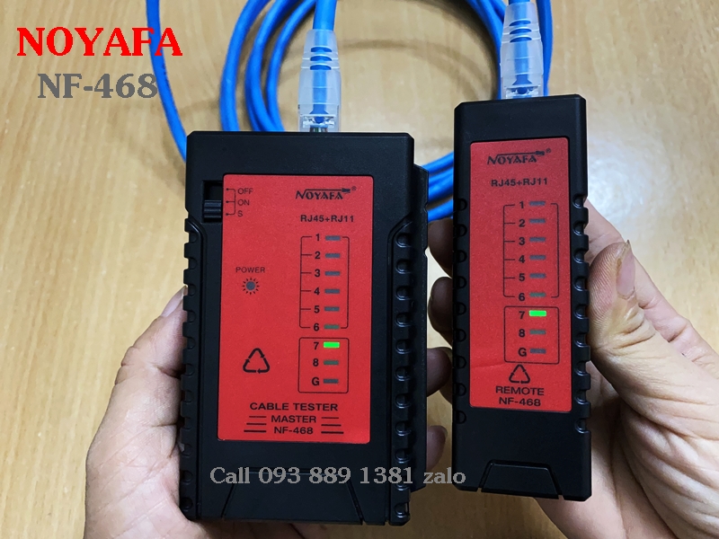 Máy test cáp mạng Noyafa NF-468 chính hãng do công ty Ánh Hào nhập khẩu và phân phối với chức năng test dây mạng chuẩn RJ45 cho cat5/ cat6 và RJ11 giúp cho các kỹ thuật viên biết quả ngay lập tức thông qua các đèn báo hiển thị trên máy test mạng.