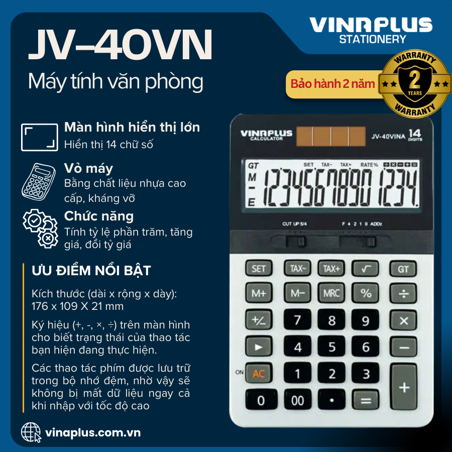 THÔNG TIN CHI TIẾT Tên sản phẩm: Máy tính JS-40TVN Thương hiệu: VINAPLUS Model: JS-40TVN Bảo hành: 2 năm Kích thước (dài x rộng x dày): 176 x 109 x 17 mm Hiển thị: 14