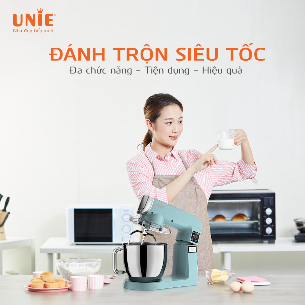 Mua tại TiktokMáy nhồi bột đa năng UNIE UE-990 có các chức năng: nhồi bột, trộn thực phẩm, đánh trứng, đánh kem. UE-990 có 10 nấc tốc độ có thể điều chỉnh tốc độ theo yêu cầu, giúp thực phẩm đạt được chất lượng tốt hơn. Trang bị 3 bộ phụ kiện chính được làm bằng hợp kim kẽm không gỉ: Đầu nhồi bột, đầu đánh trộn và đầu đánh trứng. Ngoài ra, UNIE UE-990 dung tích lớn 6.5L thoải mái trộn lượng bột lớn phù hợp với những chị em đam mê làm bánh. ƯU ĐIỂM NỔI BẬT CỦA MÁY NHỔI BỘT UNIE UE-990 Công suất lớn 1800W cho thành phẩm bột mịn hơn Unie UE-990 sở hữu công suất 1800W giúp máy hoạt động mạnh mẽ, bền bỉ. Trộn được nhiều bột hơn, thành phẩm bột mịn mướt hỗ trợ bạn làm nên những mẻ bánh ngon nhất. Dung tích thố trộn 6.5L kết hợp với nắp chống văng thông minh Với dung tích thố trộn 6.5L bạn có thể đánh được 1000g bột khô thêm 538g nước trong 1 lần đánh. Thố trộn làm bằng chất liệu inox 304 sáng bóng, chống han gỉ rất an toàn. Ngoài ra, máy có thiết kế phần nắp chống văng thông minh nên bạn yên tâm là bột sẽ luôn nằm gọn trong thố không bị bắn ra ngoài trong quá trình đánh trộn. Chất liệu thân kim loại nguyên khối bền bỉ kết hợp lớp vỏ sơn tĩnh điện màu xanh pastel hiện đại, trẻ trung Phần thân máy sử dụng thân kim loại nguyên khối giúp tăng trải nghiệm người dùng. Ngoại hình UE-990 nhìn khỏe khoắn hơn và độ bền cao không lo tình trạng hoen gỉ khi sử dụng máy trong thời gian dài. Lớp vỏ được sơn tĩnh điện màu xanh pastel đậm chất vintage sẽ phù hợp với những bạn thích thiết bị nhà bếp vừa tiện dụng vừa là vật decor cho căn bếp thêm ấm cúng. Phụ kiện đa dạng, gồm 3 đầu đánh sử dụng linh hoạt Máy nhồi bột thế hệ mới Unie UE-990 có 3 đầu trộn linh hoạt dễ dàng tháo lắp và sử dụng gồm: đầu nhồi bột, đầu đánh trộn và đầu đánh trứng. 3 đầu phụ kiện đều được làm chất liệu an toàn, chống han gỉ nên bạn yên tâm sử dụng. Màn hình LED hiển thị rõ ràng, cài đặt điều chỉnh thời gian linh hoạt Ngoài yếu tố ngoại hình băt mắt, Máy nhồi bột Unie UE-990 sở hữu bảng điều khiển cảm ứng hiện đại hiện thị thời gian, tốc độ đánh và tùy chỉnh cài đặt thời gian theo ý giúp hỗ trợ bạn tối đa trong quá trình làm bánh. Màn hình LED hiện thị các thông số thời gian, tốc độc to rõ ràng dễ quan sát. Chân đế cao su chắc chắn Thiết kế phân chân mút cao su giúp khi máy hoạt động ở công suất lớn nhất vẫn có thể bám chắc vào mặt bàn phẳng tăng tuổi thọ cho máy và tính an toàn của sản phẩm Vệ sinh dễ dàng Với vỏ ngoài được phủ sơn tĩnh điện và toàn bộ phụ kiện được làm bằng inox 304 sáng bóng, phụ kiện tháo dời linh hoạt nên việc vệ sinh máy rất dễ dàng. Với phụ kiện bạn làm sạch bằng dung dịch tẩy rửa thông thường. Với thân máy dùng khăn mềm lau sạch là được. Lưu ý không nhúng phần thân máy vào nước sẽ ảnh hưởng tới phần động cơ bên trong. THÔNG SỐ KỸ THUẬT TỔNG QUAN VỀ MÁY NHỒI BỘT UNIE UE-990 Máy nhồi bột đa năng là gì? Máy nhồi bột hay còn được gọi là máy đánh bột, máy trộn bột. Trước kia nếu muốn làm bánh, bạn phải tự tay nhào bột còn giờ đây sử dụng máy nhồi bột gia đình hay máy nhồi bột công nghiệp. Tại sao nên mua máy nhồi bột đa năng Với nhiều người thì máy nhồi bột còn khá là mới mẻ nên họ cũng có những băn khoăn không biết loại máy này có tốt không, nhồi bột có đều không? Vậy chúng ta hãy cùng xem những lý do để bạn chọn máy nhồi bột làm bánh nhé: