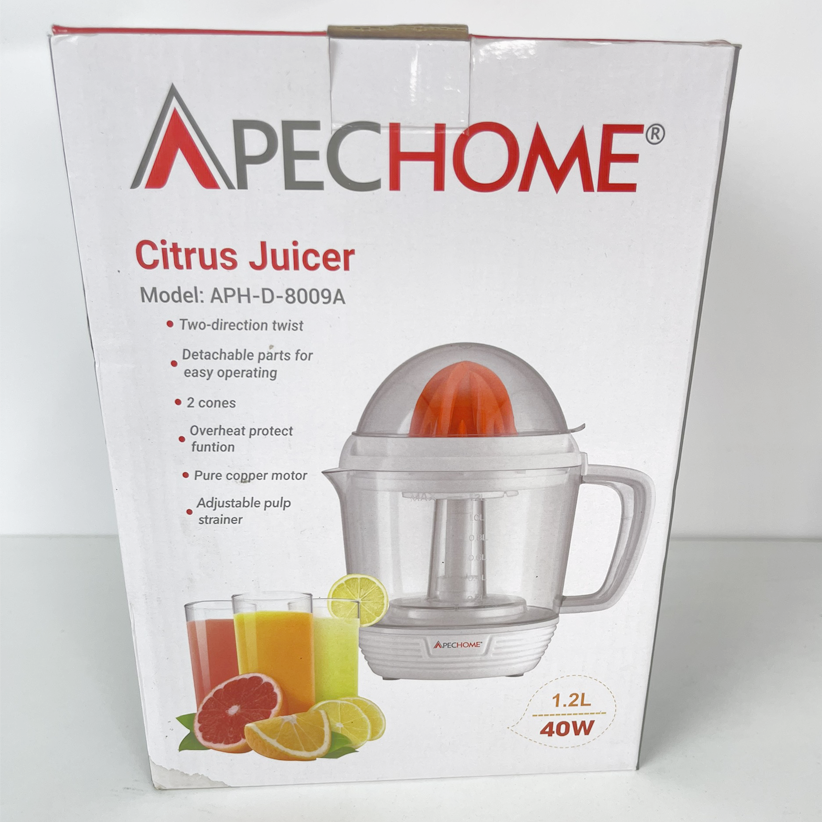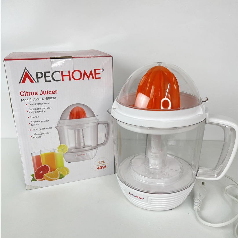 Máy vắt cam Apechome APH-D-8009A được thiết kế bền đẹp, chắc chắn. Chất liệu nhựa nhẹ, dễ vệ sinh sau khi sử dụng. Máy có dung tích 1.2 lít, công suất 40W cho khả năng hoạt động ổn định, êm ái và không tốn nhiều điện năng.