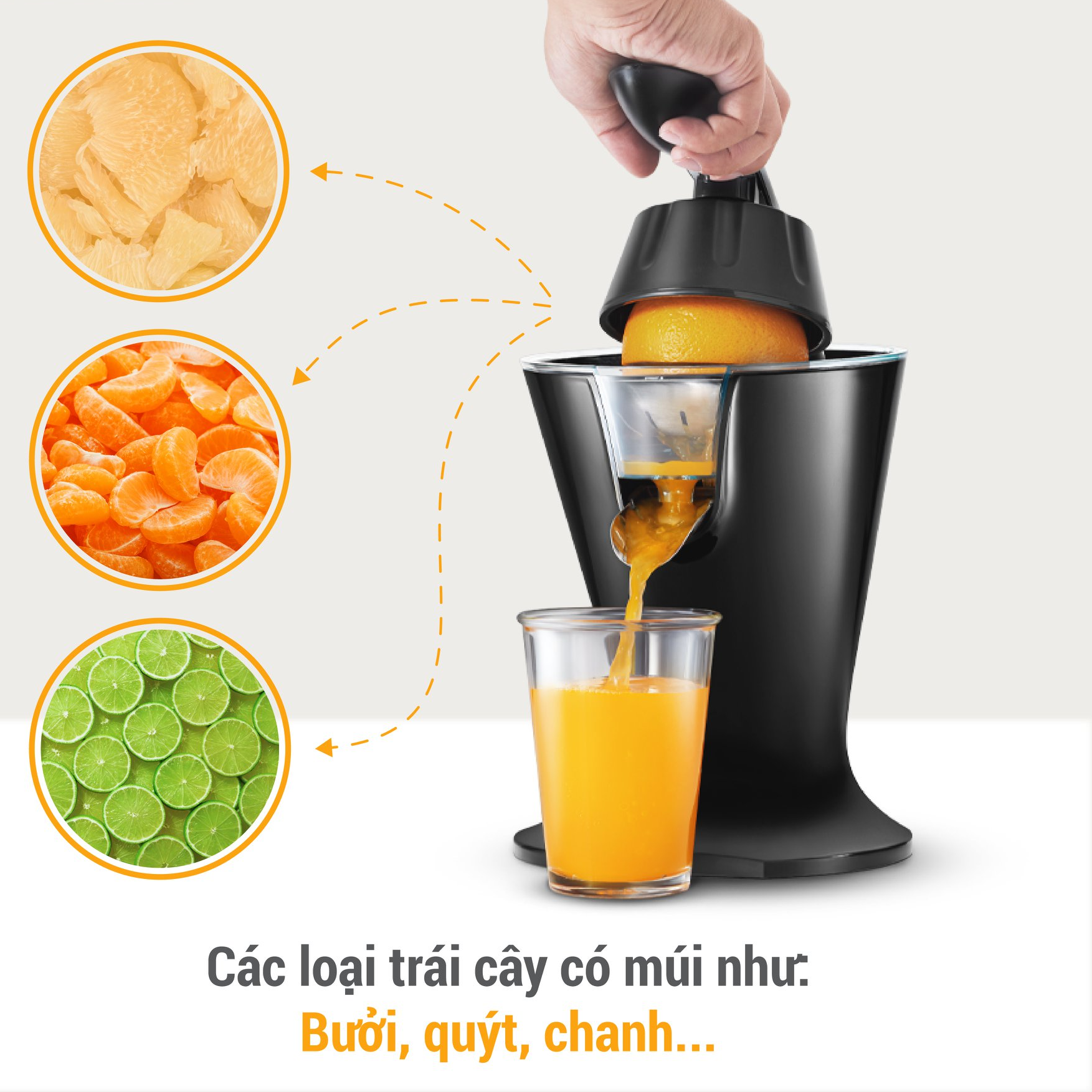 - Phù hợp để ép tất cả các loại trái cây họ cam quýt với kích thước to, nhỏ khác nhau từ chanh đến bưởi.