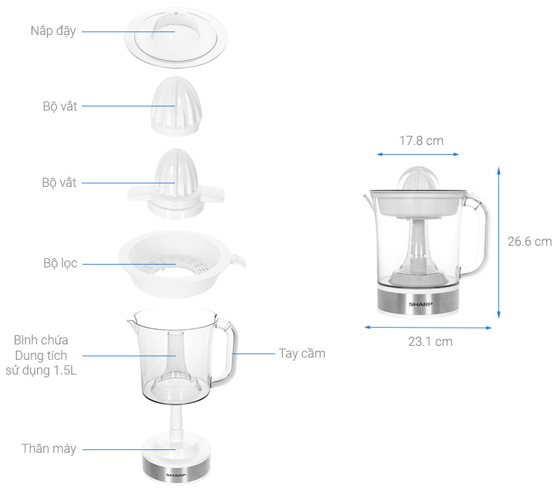 Bảo hành: 12 tháng Máy vắt cam Sharp thiết kế gọn nhẹ, màu trắng sáng tươi trẻ, có tay cầm chắc chắn Chuyên dụng để vắt các loại hoa quả họ cam như cam, bưởi, quýt, chanh, đáp ứng nhu cầu làm nước ép trong gia đình, quán nước. Hơn nữa, tay cầm và vòi rót thiết kế trên thân máy cho bạn cầm nắm, rót nước ép ra cốc đơn giản, thuận tiện. Bình chứa có dung tích 1.5 lít đựng được lượng nước ép lớn, làm bằng chất liệu nhựa AS Dung tích bình chứa 1.5 lít đáp ứng nhu cầu cho gia đình từ 2 - 4 thành viên. Ngoài ra, bình đựng nước ép được làm từ chất liệu nhựa AS nên có độ cứng cao, kháng vỡ, dễ chùi rửa. Đặc biệt loại nhựa này rất an toàn, không ảnh hưởng đến sức khỏe người dùng. Tính năng tự động đảo chiều, di chuyển theo 2 hướng để tránh kẹt, tăng độ bền cho máy, thu được lượng nước ép nhiều hơn Với tính năng tự động đảo chiều, sau mỗi lần nhấn, máy sẽ tự đảo chiều theo hướng ngược lại, nên hạn chế được lượng nước cam bị văng ra ngoài khi ép, đồng thời giúp kiểm soát lượng tép cam dễ dàng bằng cách xoay bình đựng để điều chỉnh lượng tép cam. Khay lọc và đầu vắt bằng nhựa cao cấp kháng vỡ, an toàn, 2 đầu vắt đáp ứng linh hoạt kích cỡ trái cây Vắt êm ái với công suất 40W Chỉ trong khoảng vài phút bạn đã có cốc nước cam thơm ngon để giải khát, tăng cường sức đề kháng, bổ sung vitamin C vô cùng đơn giản. Lưới lọc máy vắt cam khoét lỗ đều, nhỏ cho nước ép chảy xuống bình mịn, trong Máy vắt cam hỗ trợ khay lọc hạt hiệu quả,mang đến cho bạn một ly nước trái cây thơm ngon nhất, mà không lo bị nuốt phải hạt khi đang thưởng thức. Trang bị nắp đậy cho bạn tiện bảo quản và giữ cho máy sạch sẽ, không bị côn trùng, bụi bẩn xâm nhập Chân đế chống trượt đảm bảo cho máy đứng vững vàng, hạn chế rung lắc khi vận hành