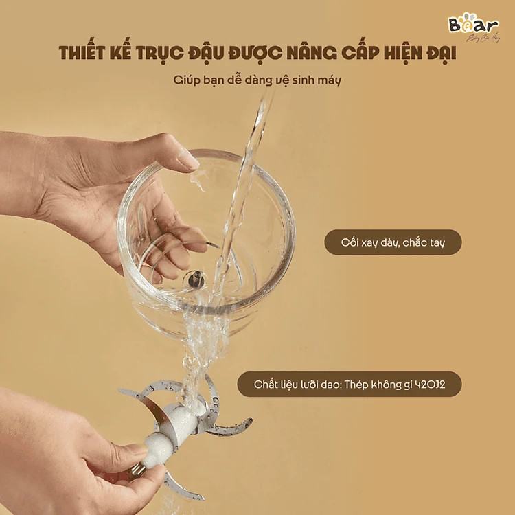 - Hướng dẫn sử dụng máy xay ăn dặm Bear QSJ-D02Q1 0.6L Bước 1: Lắp trục xay, lắp gioăng cao su chống trượt ở dưới đáy. Bước 2: Cho nguyên liệu đã cắt vào phần dung tích cốc (tránh cho nguyên liệu vượt mức vạch cốc). Lắp dao kèm nắp đậy vào phần cốc xay sao cho trùng với đầu trục xay. Sau đó, lắp tiếp phần thân máy lên trên cùng nắp đậy. Bước 3: Cắm dây điện vào nguồn, sau đó nhấn công tắc ở phần đỉnh trên cùng của thân máy để bắt đầu xay. Bước 4: Thành phẩm với thịt nhuyễn và mịn là đã xay xong.