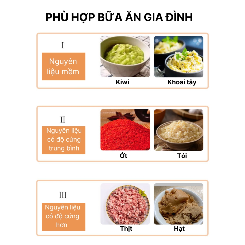 - Ba chế độ hoạt động: Cho phép người dùng điều chỉnh chế độ phù hợp với từng loại thực phẩm, từ chế biến nhẹ nhàng đến chế biến mạnh mẽ.