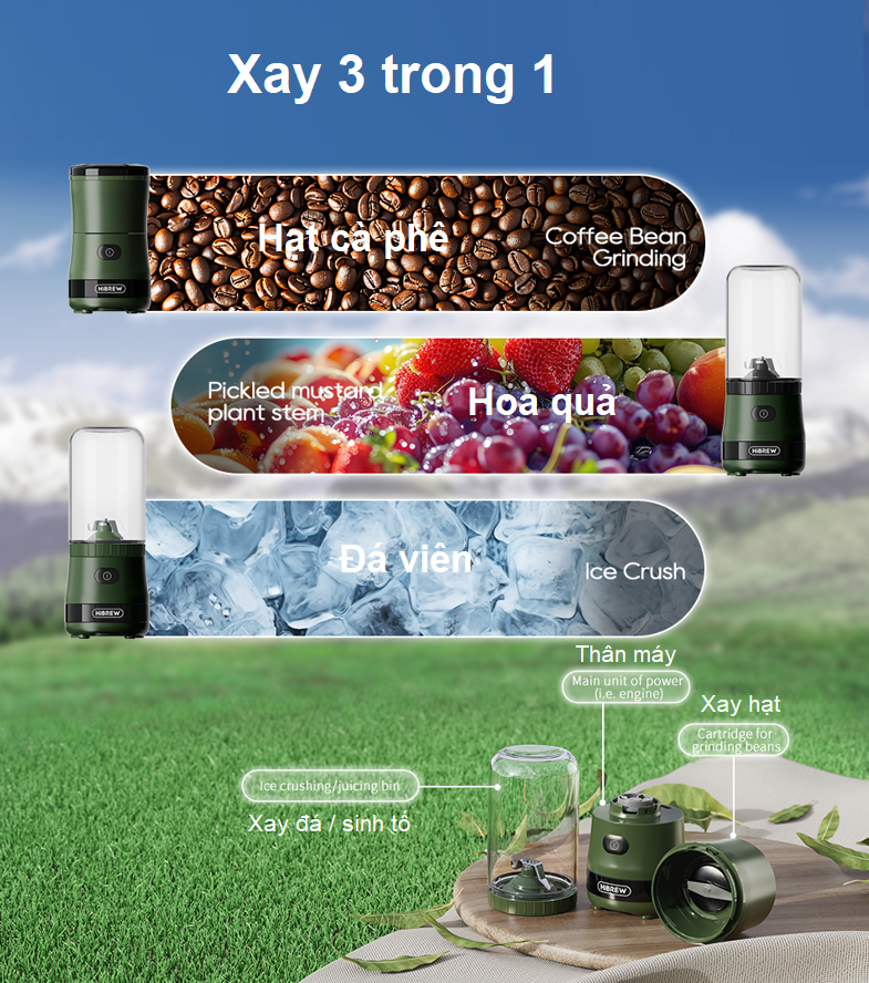 Máy xay hạt cà phê dùng pin cầm tay 3 trong 1 HiBREW G2 chuyên xay hạt cà phê và các loại hạt, xay sinh tố và xay đá viên .... Là dòng máy xay đa năng phù hợp sử