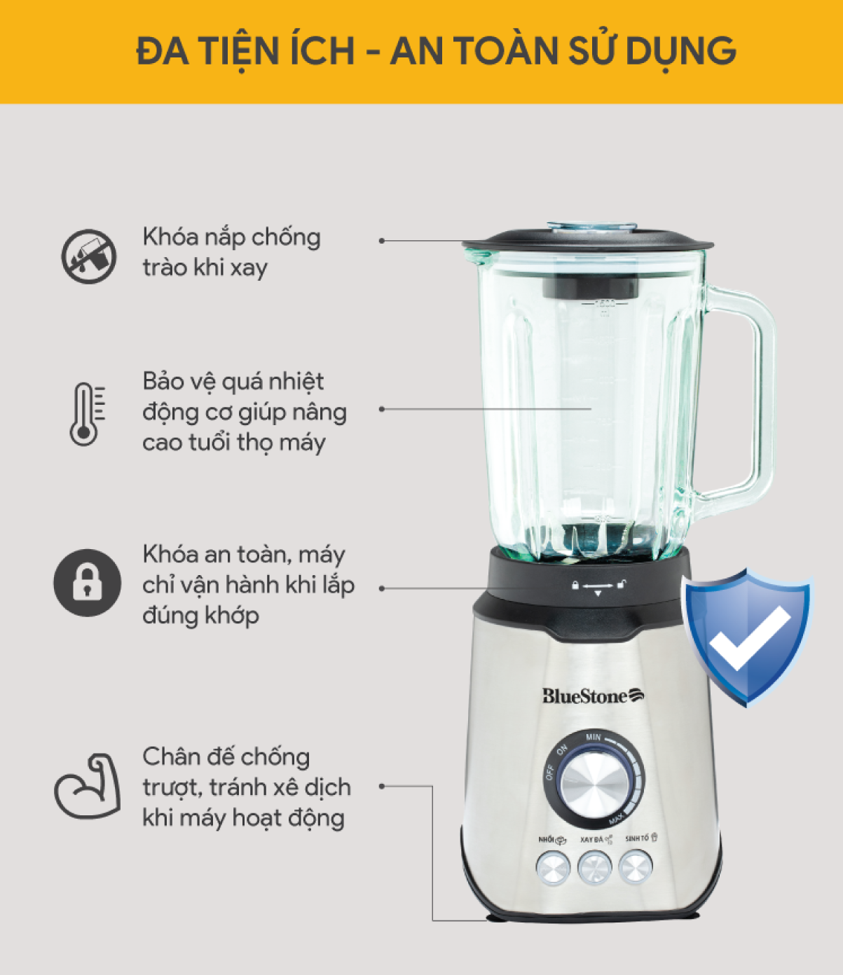 • Chế độ an toàn: Khóa an toàn, bảo vệ quá nhiệt động cơ giúp kéo dài tuổi thọ máy. Chân đế chống trượt và khóa nắp chống trào an toàn cho người dùng.