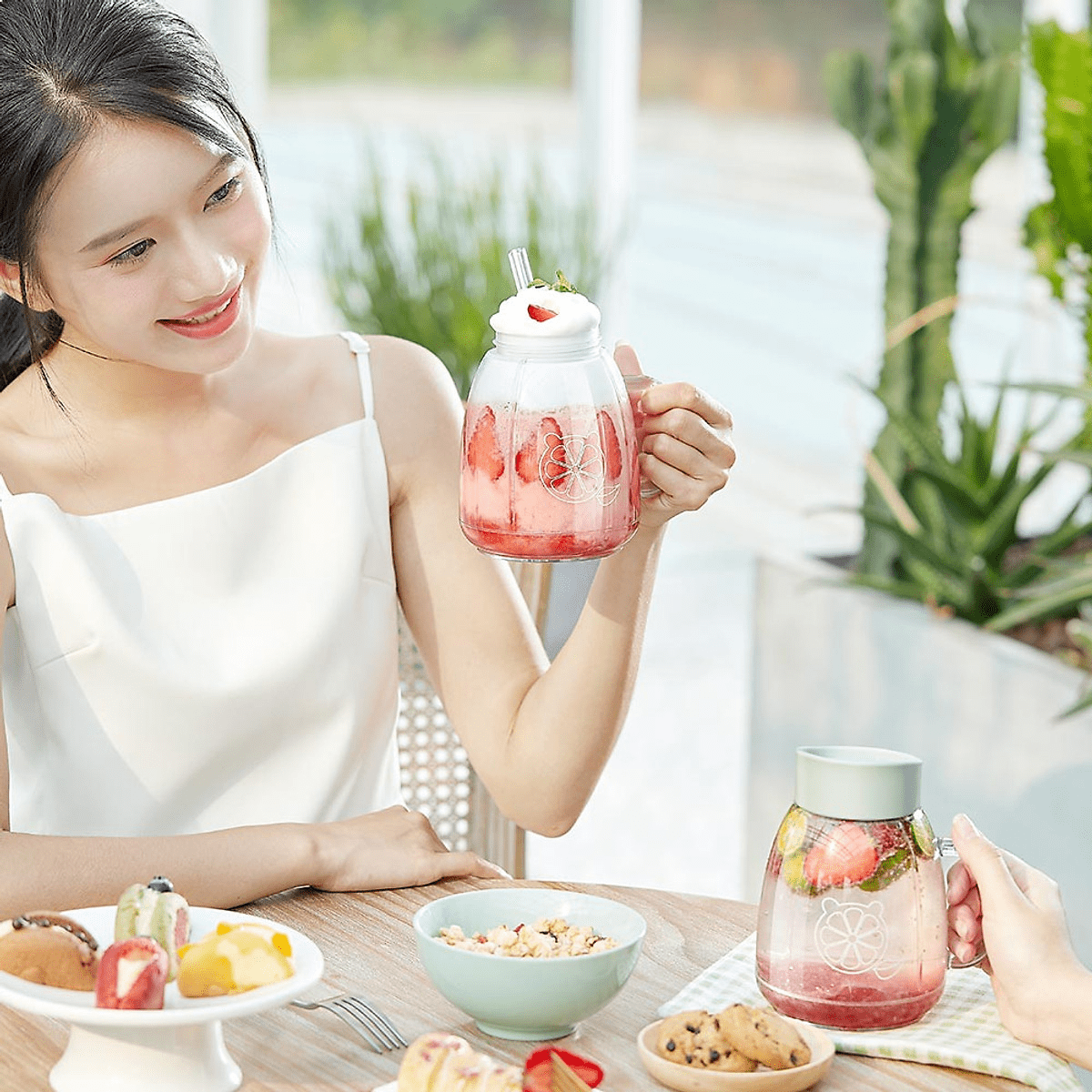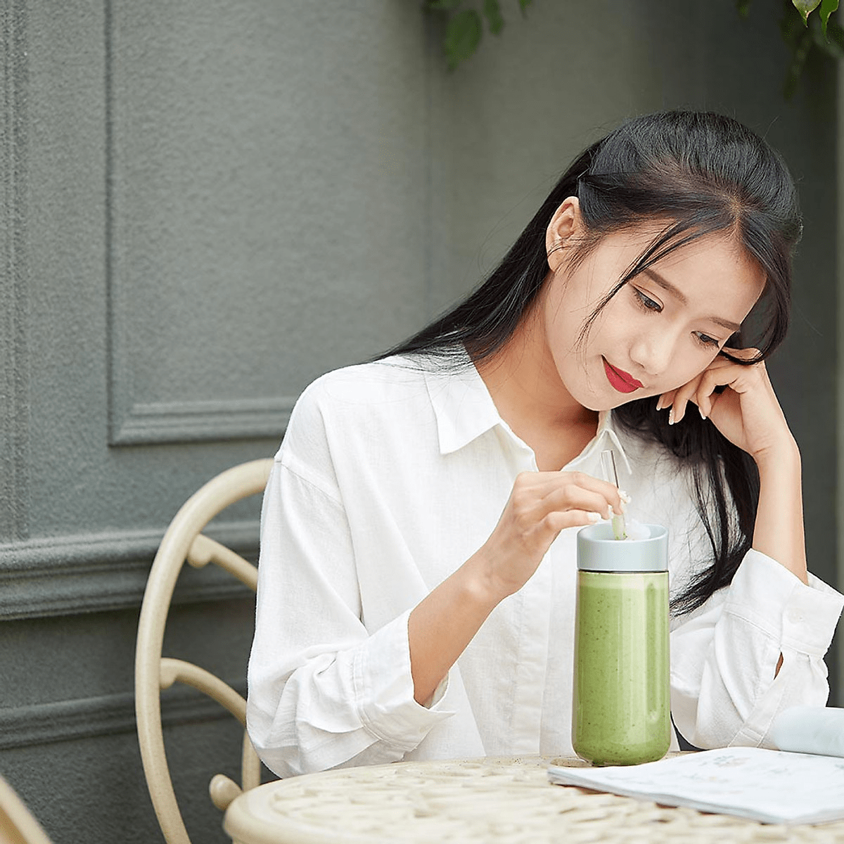 Mua tại Tiktok"* Nhỏ gọn với khối lượng 0.4kg, chỉ bằng 25 % so với máy ép bình thường, dung tích 350ml * Thiết kế cối xay kiêm bình nước di động, thuận tiện mang theo khi