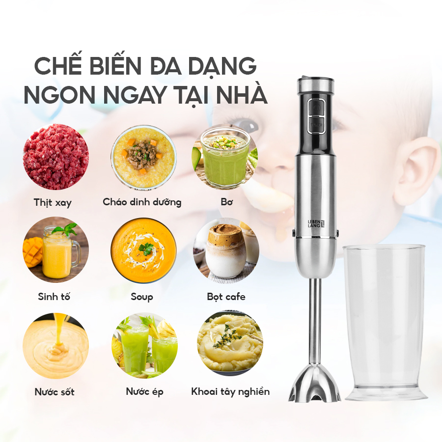 - Máy xay sinh tố cầm tay đa năng Lebenlang LBL3638 có công suất cao lên đến 1000W cho khả năng xay mịn và nhanh chóng các loại thực phẩm, từ cá, thịt, rau củ đến trái cây, giúp bạn chế biến các món ăn ngon một cách dễ dàng