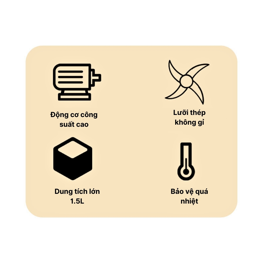 Tính năng sản phẩm : - Xay sinh tố, pha, trộn, xay đá nhỏ Tình năng an toàn : - Không đưa tay vào cối xay vì bộ dao rất bén. Luôn dùng phới