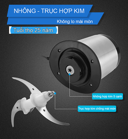 Dung tích: 2L Công suất: 250W Nguồn điện : 220v- 50Hz Vỏ máy: Chất liệu Inox 304 cao cấp, chịu nhiệt Lưỡi dao: Thiết kế 4 lưỡi bằng thép không gỉ – Sắc bén cho