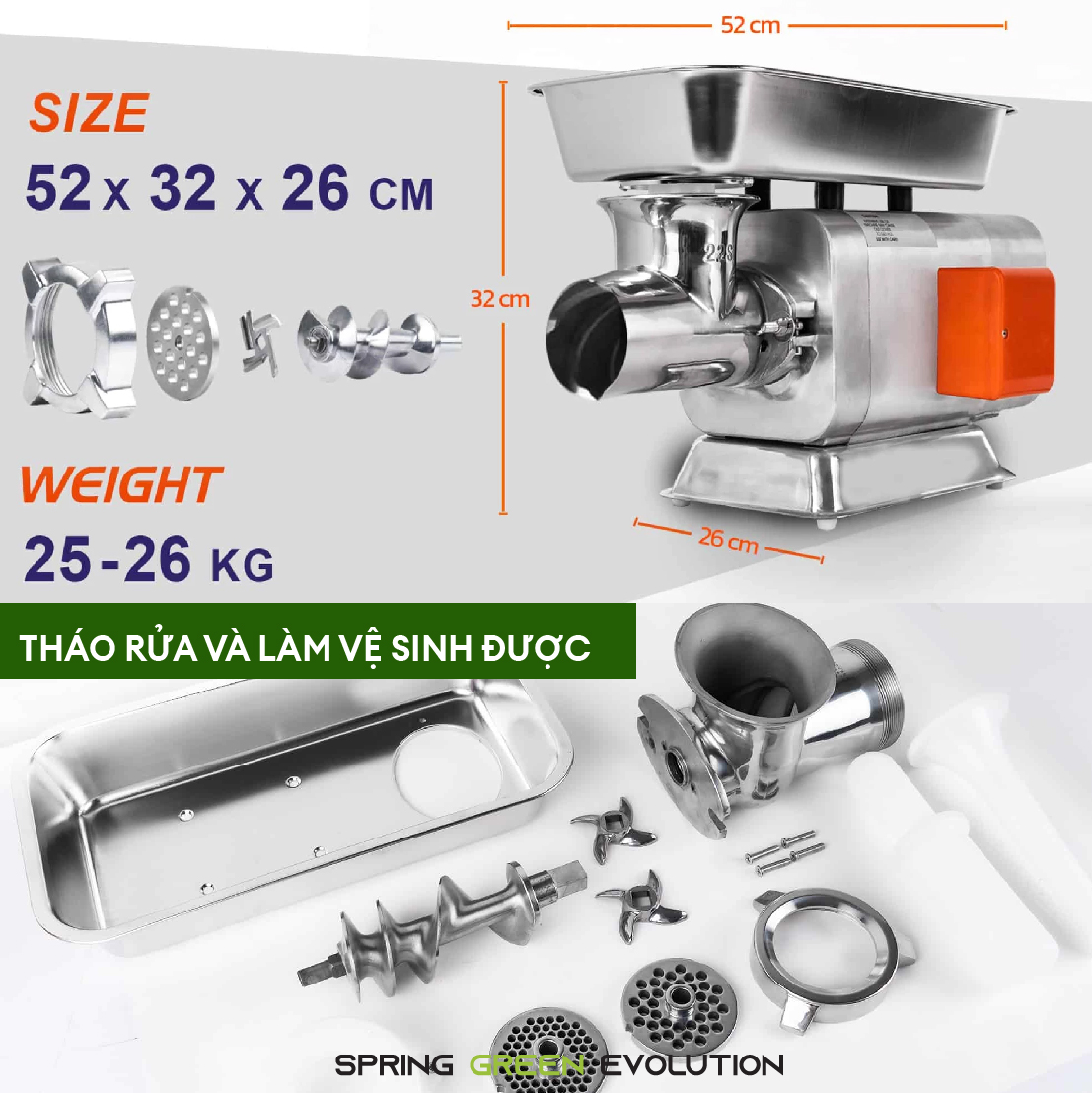 - Chuẩn bị khay để chứa thành phẩm sau khi xay ƯU ĐIỂM CỦA MÁY XAY THỊT MG TURBO Tốc độ tối đa lên tới 180 kg/h Bạn có thể xay gia vị, hành, tỏi hoặc làm xúc xích cũng không khó Đặc biệt có thể xay thịt đông lạnh không quá -5 độ -Các lưỡi dao sắc và khỏe, được thiết kế đặc biệt để xay mịn nhuyễn, dễ dàng nghiền nát cả sụn và gân Động cơ lõi đồng nguyên chất công suất lên đến 1500W, bền bỉ, việc nặng việc nhẹ cũng không ngại Sử dụng dễ dàng, phù hợp với nguồn điện dân dụng Toàn bộ máy làm từ chất liệu inox 304, kết cấu dày dặn, không rỉ sét, an toàn với thực phẩm 100% Tất cả các bộ phận có thể tháo rời để làm vệ sinh Sản phẩm có bảo hành, đảm bảo chất lượng với dịch vụ hẫu mãi sau bán hàng Máy xay thịt không tốn sức thích hợp cho sản xuất kinh doanh. Máy sẽ khiến bạn hoàn toàn hài lòng về chất lượng và sự an toàn. Sử dụng máy xay thịt chính là bí quyết tiết kiệm sức lao động trong kinh doanh, sử dụng tiện lợi, nhanh chóng, tiết kiệm thời gian với giá cả phải chăng. Làm xúc xích truyền thống dễ dàng, không tốn sức. Miễn phí! dụng cụ làm xúc xích Khay inox 304 chứa được nhiều hơn Có thể xay thịt đẹp mắt trộn đều thịt HÌNH ẢNH MỘT SỐ SẢN PHẨM DÙNG VỚI MÁY XAY THỊT MG TURBO CẤU TẠO CỦA MÁY XAY THỊT CÔNG NGHIỆP MG TURBO Máy xay thịt (Meat mincer) nguồn điện 220V tương thích với nguồn điện dân dụng, thiết bị chính bao gồm 7 bộ phận: