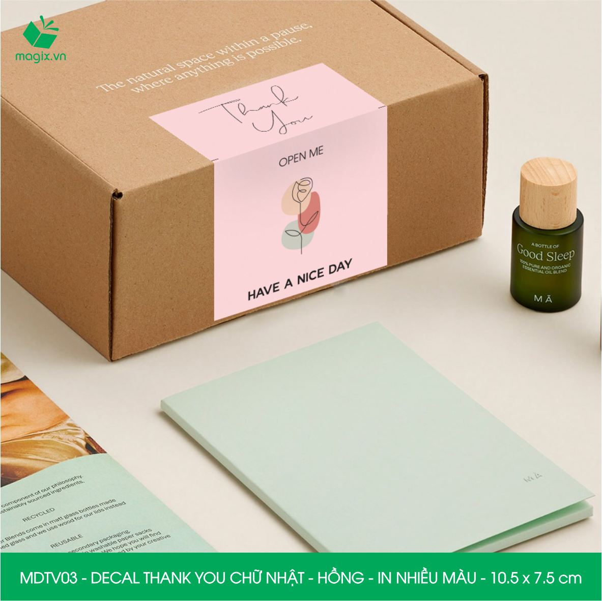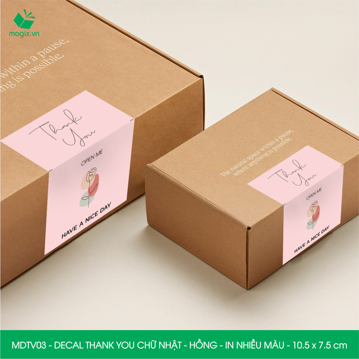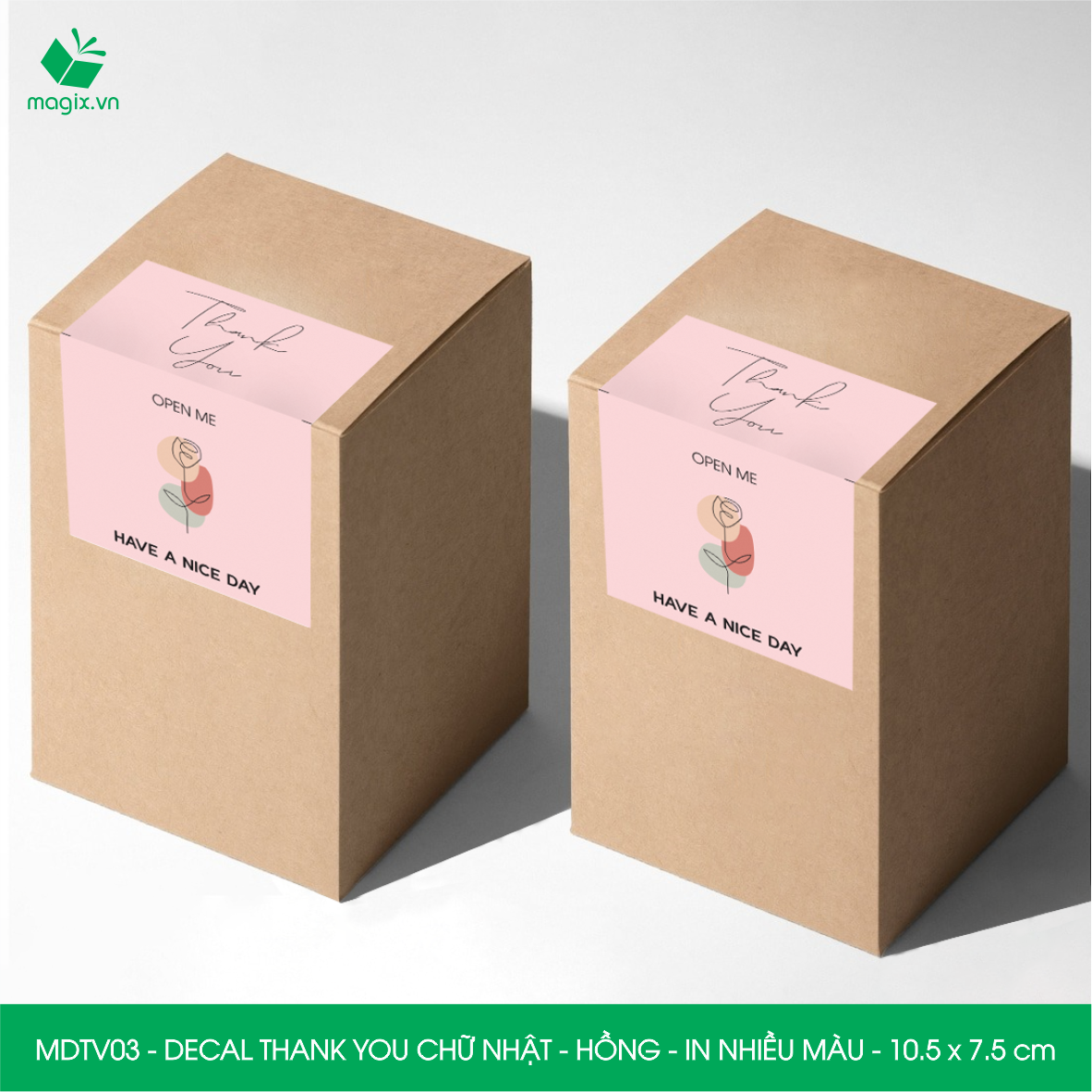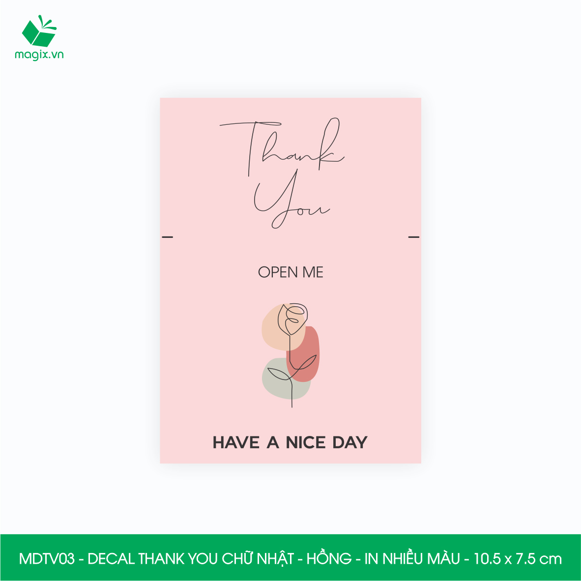 Chất liệu: Decal Thank You được làm từ giấy decal 3 lớp trên bề mặt được phủ thêm 1 lớp màng mờ, tăng khả năng chống thấm nước giúp decal bền hơn. Ngoài ra khi cán thêm lớp màng mờ sẽ giúp món quà trở lên sang trọng và bắt mắt hơn.