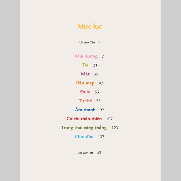 Mèo méo meo gồm 10 phần, tương ứng với cách mèo cách mèo bày tỏ cảm xúc qua từng bộ phận và thậm chí cả những khoảnh khắc chúng muốn “cách ly xã hội”: Mùi hương, Tai, Mắt, Râu mép, Đuôi, Tư thế, Âm thanh, Cử chỉ thân thiện, Trạng thái căng thẳng, Chơi đùa. Quyển sách đáng yêu này không chỉ giúp bạn nhận ra những “dấu hiệu” thể hiện sự tin tưởng, yêu thương của mèo mà còn cung cấp kiến thức về cách chúng trò chuyện với chúng ta, bày tỏ nhu cầu hay đòi hỏi không gian riêng tư. Đặc biệt, với những hình minh họa dễ thương và nội dung khoa học được đơn giản hóa, bạn sẽ có cảm giác như đang bước vào một cuộc đối thoại thật sự với người bạn nhỏ của mình.