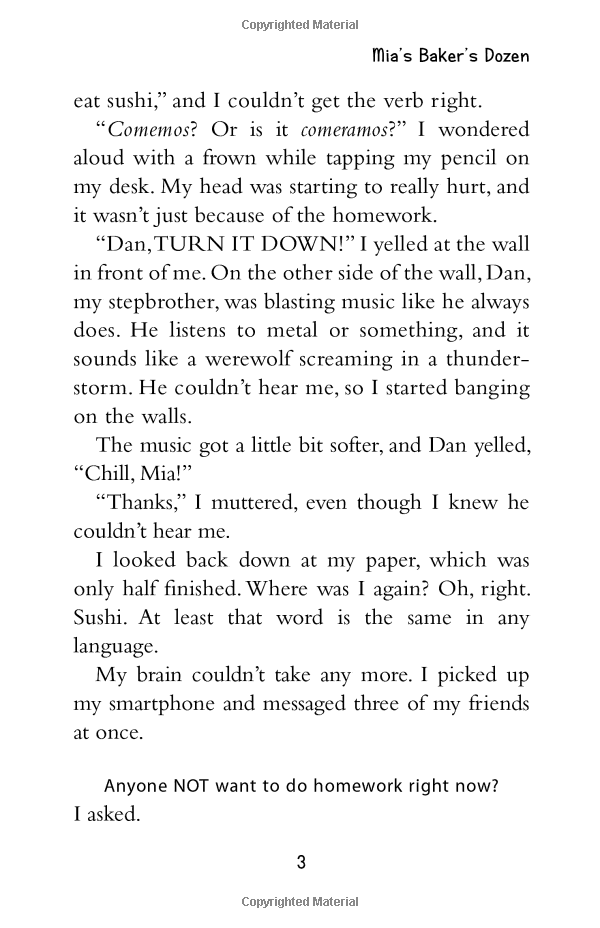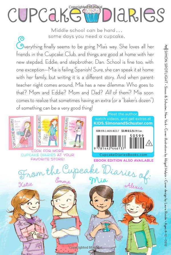 Mia is getting used to her new family now that her mom is remarried to Eddie and she's gained a new stepbrother, Dan. She's in the groove of going to her dad's house on the weekends, and everything is going pretty well at home and at school. Well, except for Spanish class. Mia's parents and stepfather speak it and she does too--but speaking it and writing it are two different things, and somehow Mia ends up in the hands of the merciless Mrs. Alvarez and almost failing Spanish class. Still, things are so good at home that Mia doesn't want to worry anyone or rock the boat. But when her parents find out--all three of them--she realizes that instead of having two parents, she's lucky enough to have three, and all three of them pitch in to help her. A baker's dozen is a bonus!