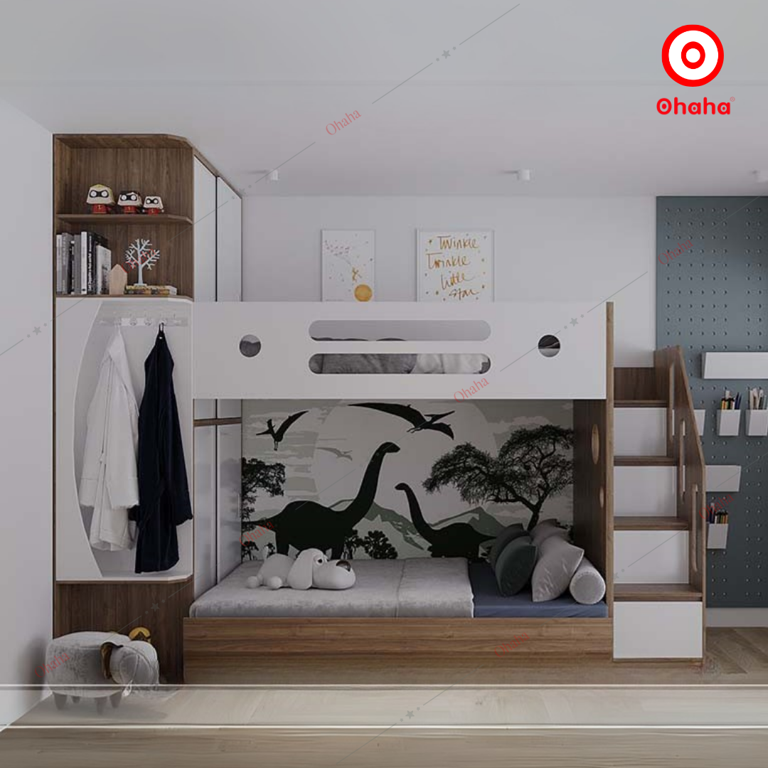 Mẫu Giường tầng thông minh Ohaha kết hợp tủ quần áo - GTTM043 sở hữu thiết kế thông minh phù hợp với các căn phòng có không gian hạn chế, đồng thời cũng mang đến nhiều công năng hữu dụng. Chỉ trong một sản phẩm, bạn có thể tận dụng được nhiều món đồ nội thất mà lại không chiếm quá nhiều diện tích không gian.