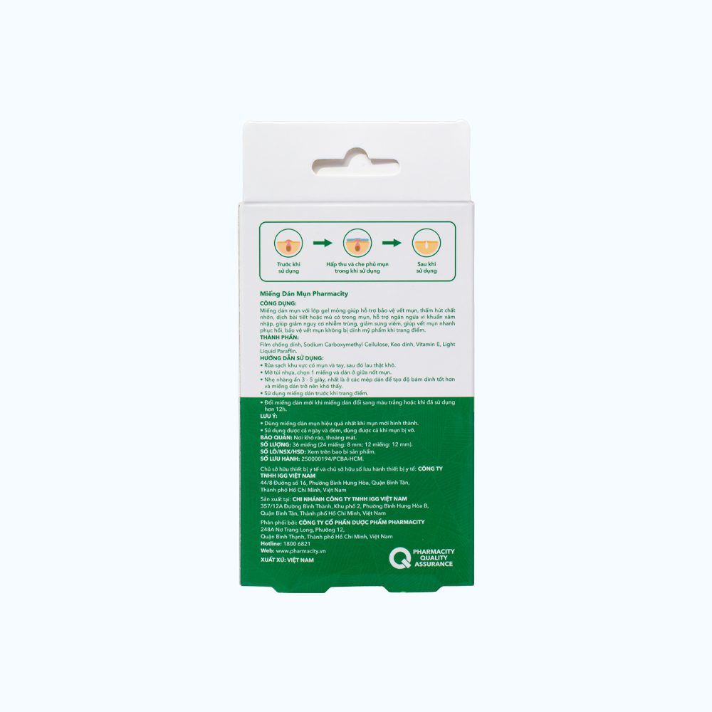 Miếng dán mụn Pharmacity với lớp màng siêu mỏng được cấu tạo từ Hydrocolloid hỗ trợ việc thấm hút cặn bã nhờn, dịch bài tiết hoặc mủ có trong mụn, ngăn ngừa vi khuẩn xâm nhập và giảm nguy cơ nhiễm trùng, giúp da nhanh phục hồi và giúp bạn tự tin khi trang điểm. Thành phần: Hydrocolloid dressing Công dụng: Thấm hút cặn bã nhờn, dịch bài tiết hoặc mủ có trong mụn, ngăn ngừa vi khuẩn xâm nhập và giảm nguy cơ nhiễm trùng, giúp da nhanh phục hồi, giúp bạn tự tin khi trang điểm. Hướng dẫn: Rửa sạch khu vực có mụn và tay, sau đó lau thật khô. Mở túi nhựa, chọn 1 miếng và dán ở giữa nốt mụn. Nhẹ nhàng ấn 3-5 giây, nhất là ở các mép dán để tạo độ bám dính tốt hơn và miếng dán trở lên khó thấy. Sử dụng miếng dán trước khi trang điểm. Đổi miếng dán mới khi miếng dán đổi sang màu trắng hoặc khi sử dụng hơn 12 giờ. Bảo quản: Nơi khô ráo thoáng mát, tránh ánh nắng trực tiếp. Quy cách đóng gói: Hộp 20 miếng đường kính 0.8cm
