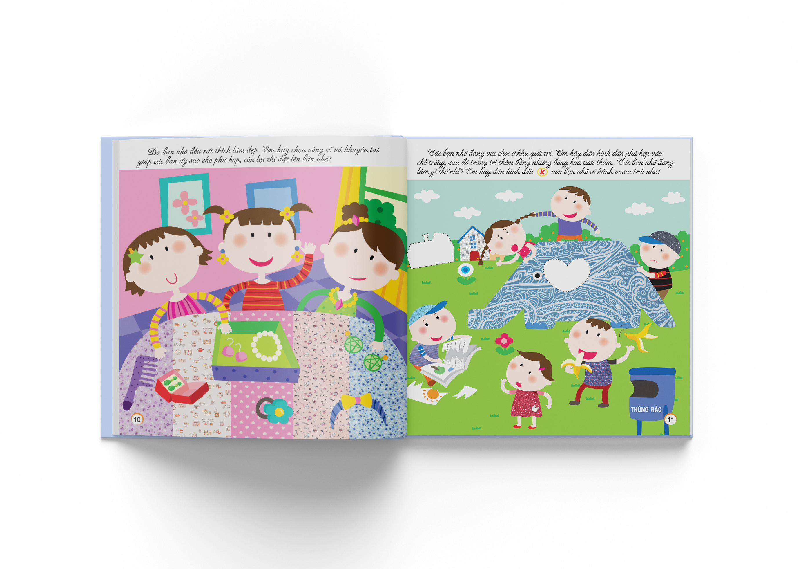 Chủ đề thứ ba,Phát triển chỉ số sáng tạo (CQ),hứa hẹn sẽ đem đến các bài tập mới mẻ hơn cả khi trẻ được dán những chiếc thuyền nhiều màu sắc trên mặt nước, giúp chị em My trồng rau, dán những ngôi nhà xinh xắn lên bãi cỏ để thành phố thêm đẹp và đông vui, dùng họa tiết trang trí cho chiếc váy thêm đẹp, cùng chơi trò thổi bong bóng. Trẻ còn có thể giúp bạn xâu một chiếc vòng cổ xinh xắn để tặng mẹ từ những vỏ sò, vỏ ốc nhặt được, trang trí thêm vảy cho những chú cá đáng yêu hay thám hiểm vũ trụ kì thú và dùng trí tưởng tượng cùng các miếng dán để trang trí cho không trung thêm đẹ
