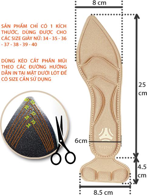 - Mặt dưới miếng lót in các đường cong tương ứng các size 35 - 36 - 37 - 38 - 39 - 40. Dùng kéo cắt theo các đường cong này để có được kích thước cần sử dụng. Phần lót bọc gót sau có keo 3M để dán cố định vào sau giày.