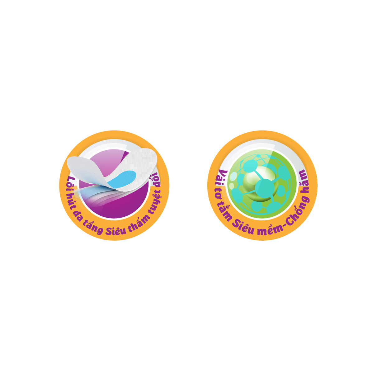 - Lõi hút đa tầng siêu thấm, thấm hút hiệu quả, làm thoáng khí, hút thấm tuyệt đối vùng ẩm trong tã giúp bé luôn khô ráo, không sợ nóng bức, hăm tã gây khó chịu cho bé.
