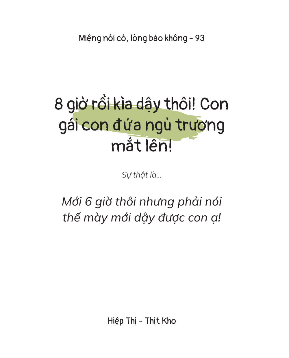 “Miệng nói có lòng bảo không” là cuốn sách nhỏ xinh tổng hợp 7749 câu nói, tình huống đời thường mà bất cứ ai cũng đều gặp phải; nhưng được giải nghĩa dưới góc nhìn dí dỏm và “không lường trước được”; khiến bạn đọc không khỏi bất ngờ, ngơ ngác và “bật cười té ghế”. Lật giở từng trang sách, bạn sẽ được “gặp gỡ" chính mình cùng “những nhân cách khác" của bản thân, mà nhân cách nào cũng… đáng yêu vô cùng.