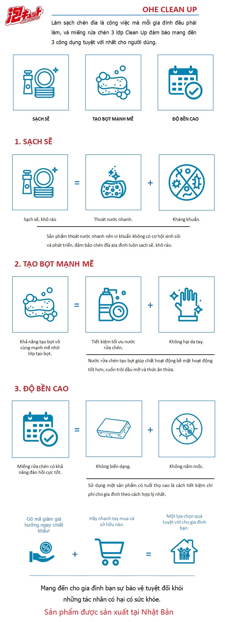MIẾNG RỬA CHÉN BÁT OHE CLEAN UP 3 LỚP KHÁNG KHUẨN, TẠO BỌT NHANH NỘI ĐỊA NHẬT BẢN