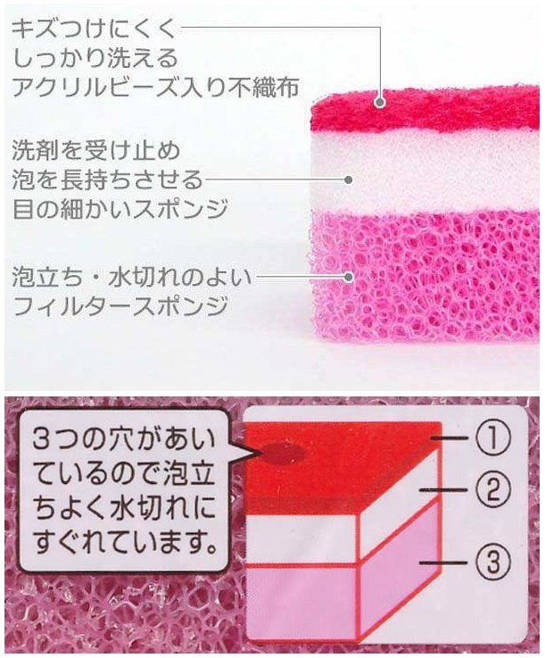 Miếng rửa chén bát tạo bọt, kháng khuẩn, nhanh thoát nước 3 lớp, 2 màu tươi sáng – kích cỡ 11,8 x 5,9 x 3,2 cm (Made in Japan) Xuất xứ: Nhật Bản/ Made in