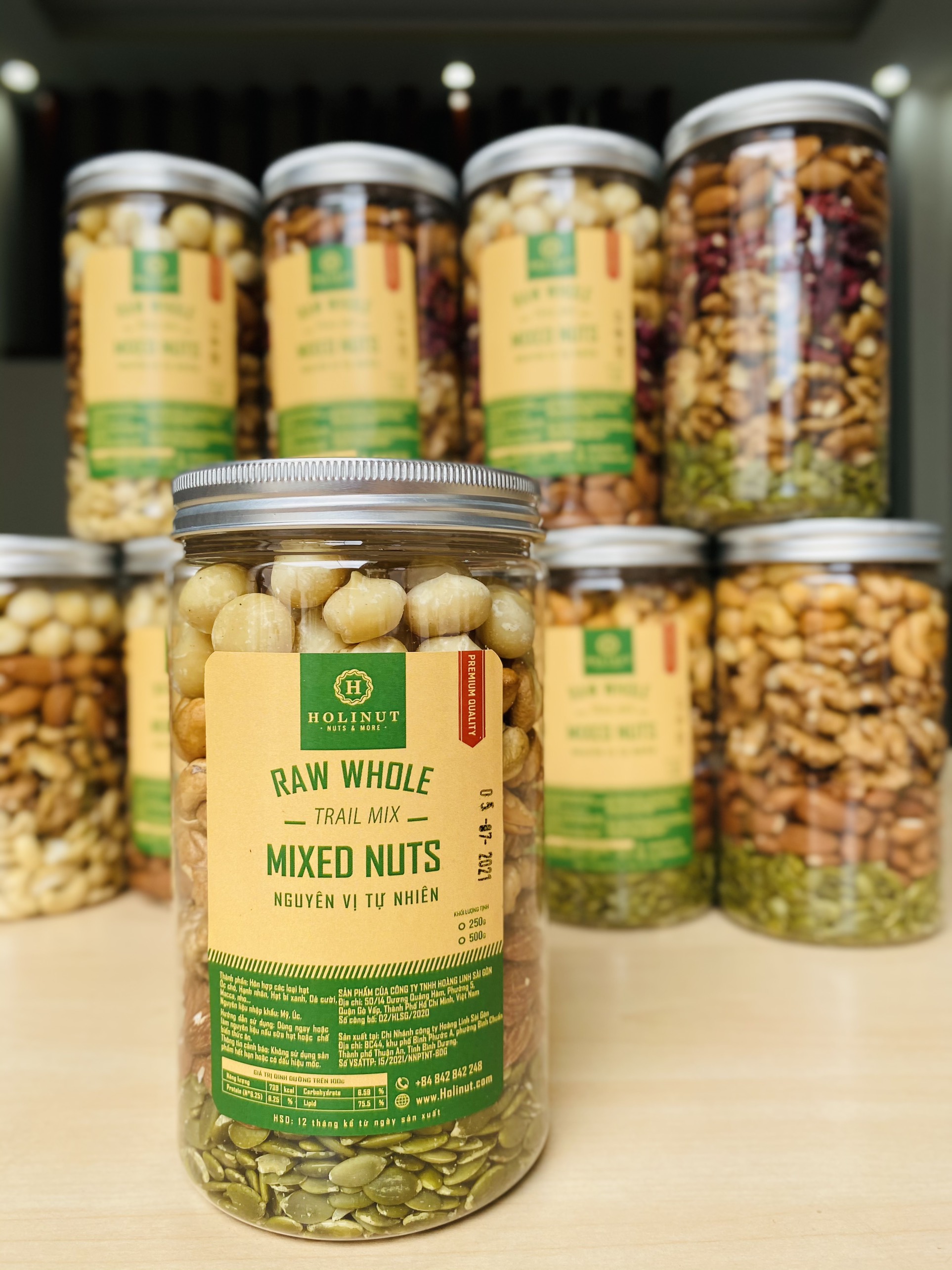 Mix hạt dinh dưỡng ăn liền tại Holinut Thành phần: Hạt bí rang, hạnh nhân rang mộc, nhân óc chó vàng, nhân macca, điều tách lụa. Quy cách: hũ/500gram Công dụng của 5 loại hạt mix