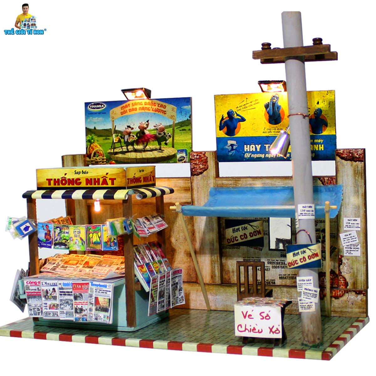 - SẢN PHẨM KHÔNG ÁP DỤNG ĐỔI TÊN BẢNG HIỆU GIÁ SẢN PHẨM CHƯA BAO GỒM THUẾ VAT, KHÁCH CẦN XUẤT VAT XIN VUI LÒNG LIÊN HỆ THẾ GIỚI TÍ HON QUA CHATBOX Mô Hình Thu Nhỏ Sạp Báo Sài Gòn Xưa - AD01 Độc Quyền Báo mới đây, báo mới đây!!! Hình ảnh những sạp bán báo gắn liền với tiệm hớt tóc lề đường có lẽ không xa lạ với những người Sài Gòn hồi xưa, hoặc những bạn trẻ 8x-9x. Những sạp báo khi ấy chính là một thế giới thu nhỏ trong đó với tin tức, biến động, sự đổi thay của thời thế. Bây giờ công nghệ phát triển, chỉ một cú click chuột là con người ta có thể biết được tin tức của cả thế giới ngày hôm đó, những sạp báo giấy dần dần thưa dần. Còn cái tiệm hớt tóc thì buồn thay, đã biến mất khỏi đất Sài Gòn này tự bao giờ… Mô hình lắp ráp thu nhỏ Sạp Báo Sài Gòn mô phỏng tái hiện lại một góc nhỏ SG đang dần bị quên lãng, nhường chỗ lại cho những công trình hiện đại của một SG phát triển và nghĩa tình Mô tả chi tiết hấp dẫn như thật Vé số chiều xổ với phiên bản siêu nhí Video Hướng Dẫn Lắp Ráp Thông số mô hình Đánh giá độ khó Kích thước sản phẩm 24x12x22 CM (Dài x Rộng x Cao) Xuất xứ VIỆT NAM Cân nặng 1.0 Kg Nguyên vật liệu Gỗ, hoa cỏ khô, vải, giấy, kim loại, đèn Led, gốm sứ,nhựa,... Sản phẩm bao gồm Hộp Pin có công tắt, nguyên vật liệu lắp ráp, sách hướng dẫn Tiếng Việt Phụ kiện làm mô hình (Mua riêng): Keo chuyên dụng + Mica che bụi + Bộ dụng cụ Kit...() Shop hỗ trợ lắp ráp luôn nếu bạn có nhu cầu (có phụ phí) Kích thước thật của mô hình Sạp Báo Sài Gòn xưa thu nhỏ AD01 Thành Phẩm Của Khách Hàng Khi phố thị lên đèn Bí Kíp Ráp Nhà Đẹp: Các bạn nên dùng Keo Chuyên Dụng UFO, Keo UFO hỗ trợ rất nhiều khi lắp ghép, đẹp hơn, nhanh khô, dễ tái chế, có thể tháo ra khi bạn ráp không đúng. >>> THẾ GIỚI TÍ HON CÙNG SÁNG TẠO - VUI HANDMADE