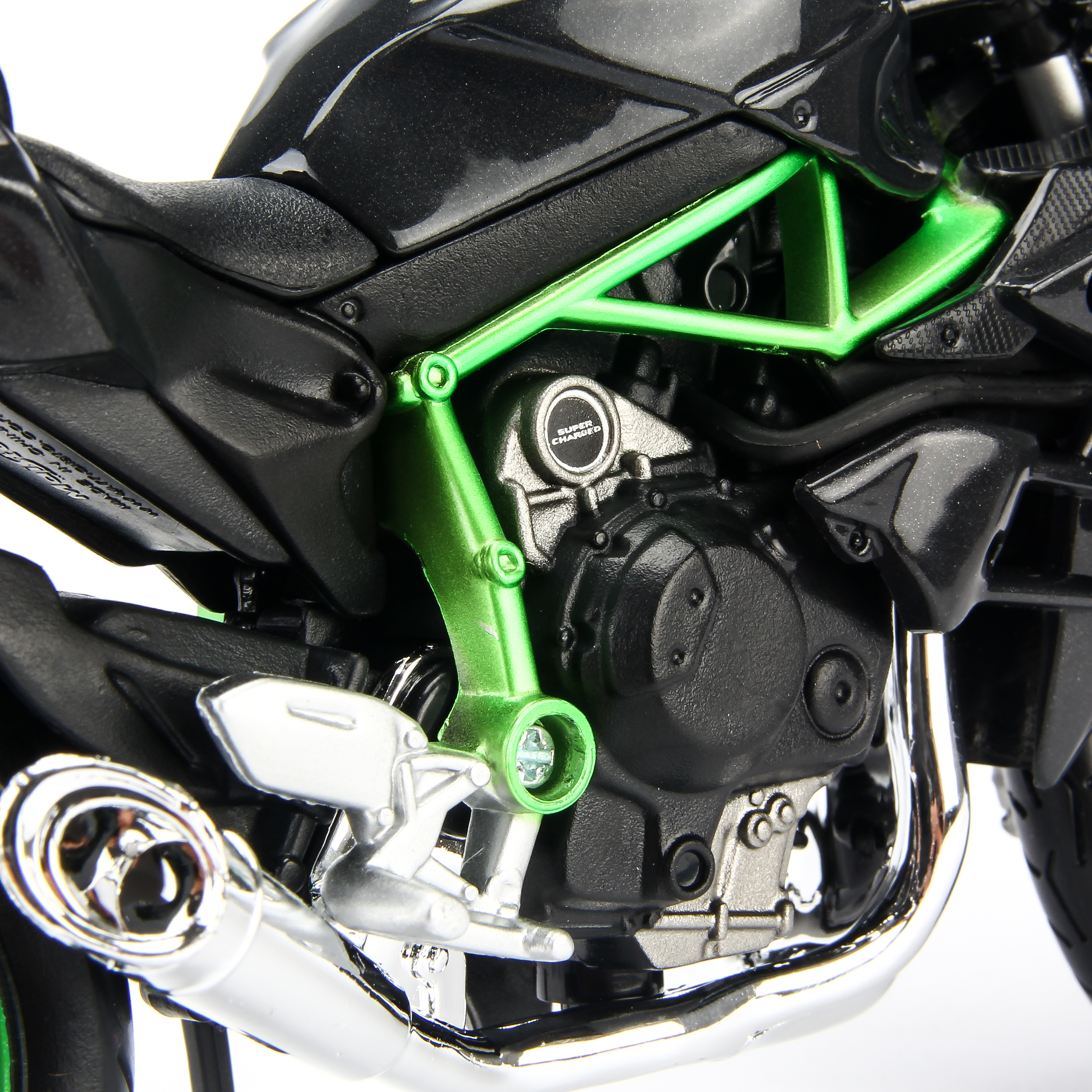 Phần thân sau phía trên từ đuôi tới bình xăng của Kawasaki Ninja H2R tỷ lệ 1:12 được làm bằng kim loại, phần đầu xe và các bộ phận khác được làm từ chất liệu nhựa, nhưng các đường vân carbon trên thân vỏ cùng các chi tiết trên xe được Maisto chế tác với độ tinh xảo cao, tạo nên cảm giác chân thực. Ngoài ra, bánh trước của mẫu mô hình mô tô Kawasaki Ninja H2R tỷ lệ 1:12 có thể bẻ lái được, và phuộc sau có thể nhún được.