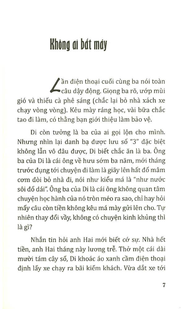 Thế giới của riêng cô có ngày bị x.âm phạm bởi một người đàn ông. Kẻ lạ mặt đang thoải mái ngồi hút thuốc trên chiếc xe cần cẩu rỉ sét. Điếu thuốc tàn, anh thẳng tay quăng xuống. Cô hốt hoảng chạy lại, giơ gót giày cao gót định giẫm tắt. Gặp lá ướt, gót giày trượt đi, cô té xuống đất ê ẩm. Anh cười khùng khục, không có vẻ gì sẽ bước xuống đỡ cô dậy. Cô tự m.ình đứng lên, sau khi đã trút bực bội cho tàn thuốc tắt ngấm, chống nạnh quắc mắt nhìn kẻ xâm lấn không gian riêng của m.ình:
