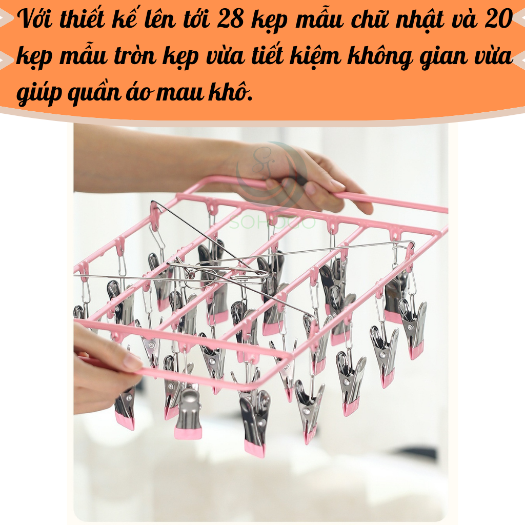 - Mỗi móc treo đều có nhiều kẹp inox cố định chắc chắn, giúp giữ đồ không bị rơi khi phơi.
