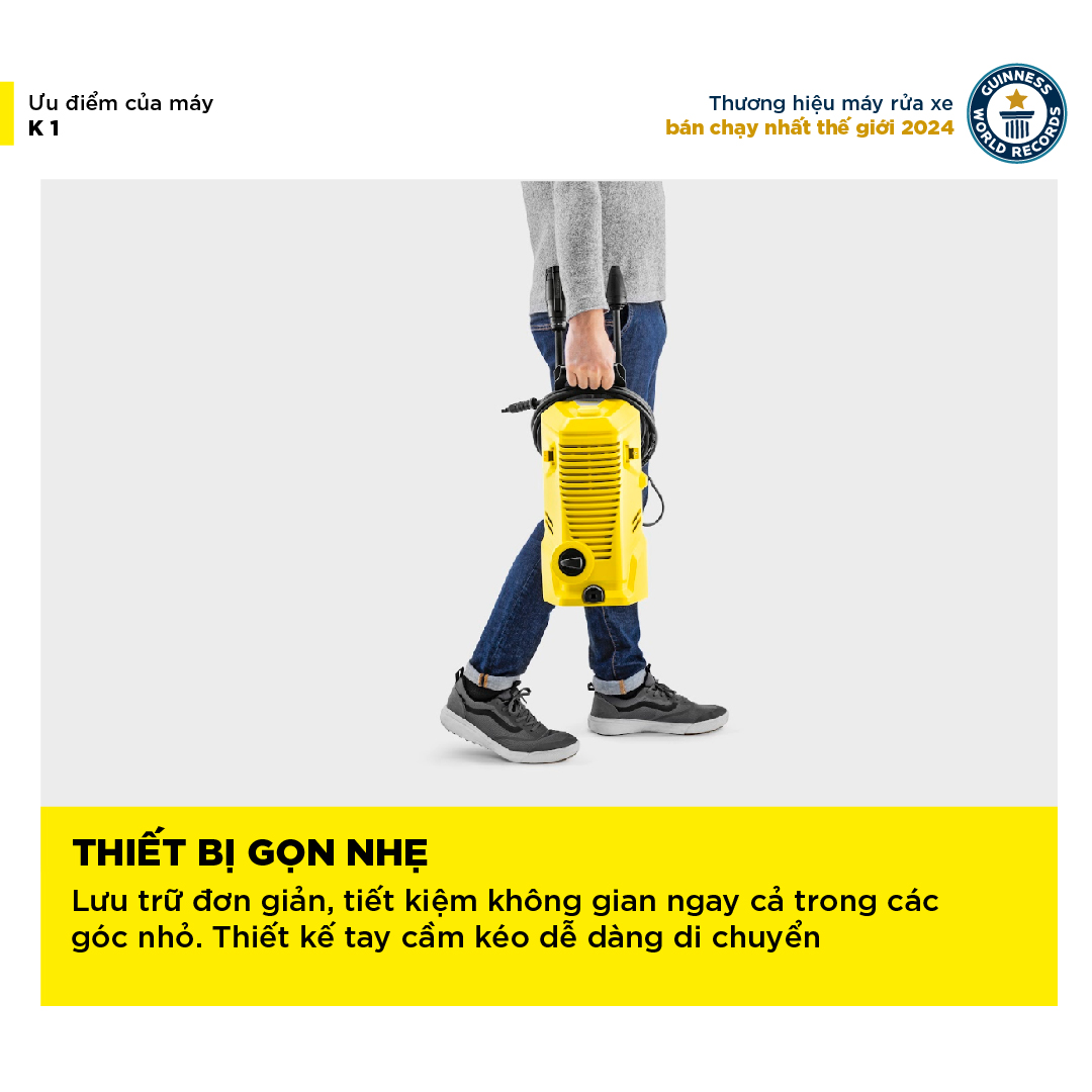 - Máy phun rửa áp lực cao K 1 là một dòng máy xịt rửa cao áp được chạy với động cơ chổi than, với áp lực lớn đến 90 bar, hỗ trợ làm sạch các vết bẩn thông thường trên xe máy, ban công, sân thượng nhỏ