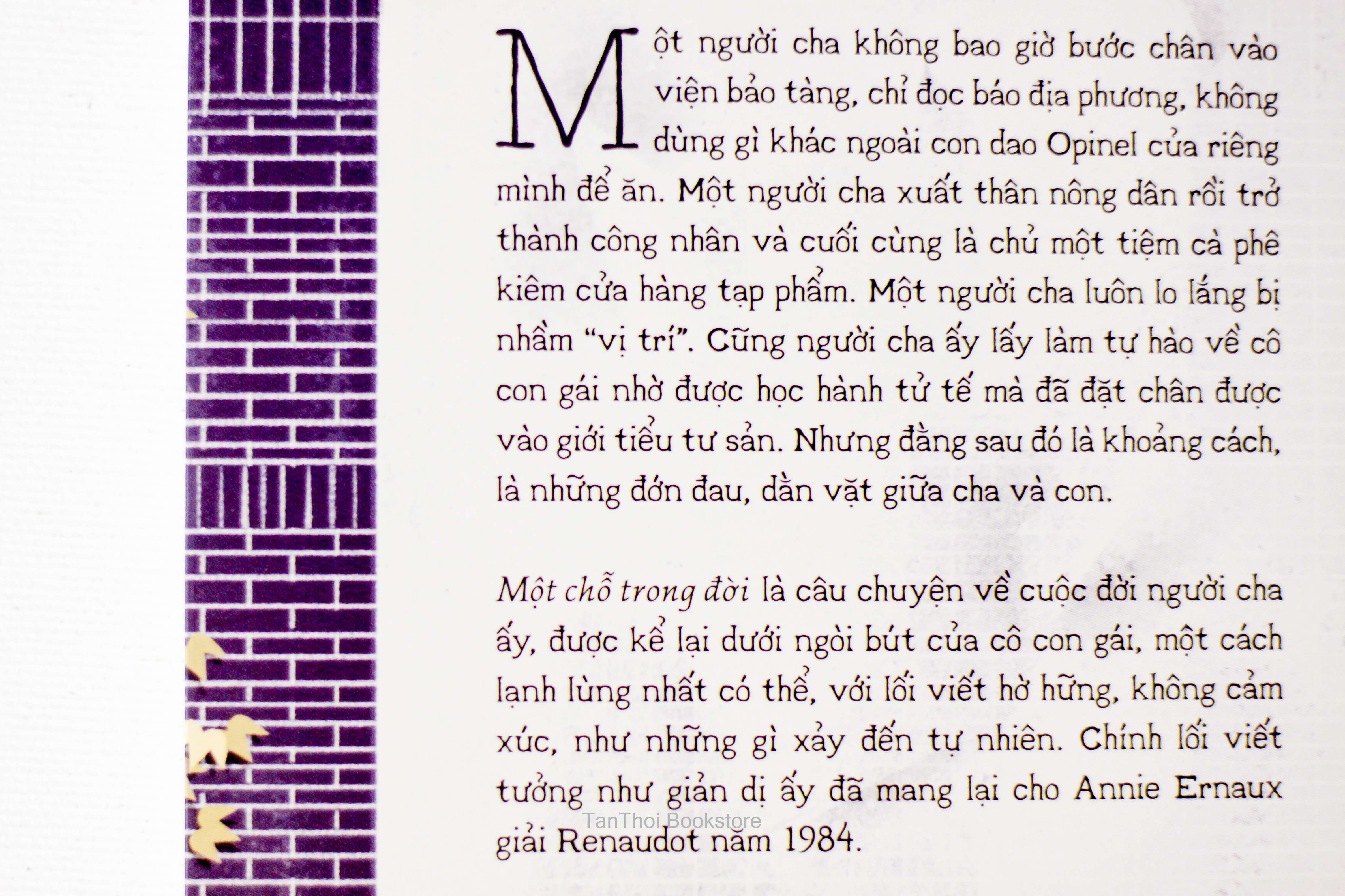 Một chỗ trong đời là câu chuyện về cuộc đời người cha ấy, được kể lại dưới ngòi bút của cô con gái, một cách lạnh lùng nhất có thể, với lối viết hờ hững, không cảm xúc, như những gì xảy đến tự nhiên. Chính lối viết tưởng như giản dị ấy đã mang lại cho Annie Ernaux giải Renaudot năm 1984.