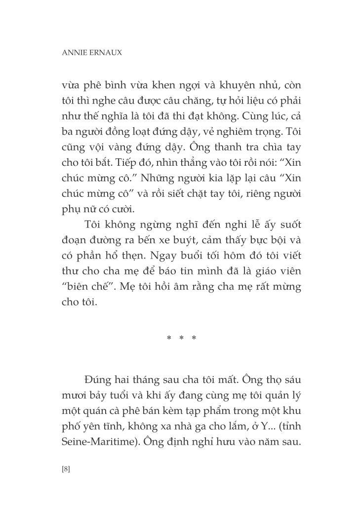 Một người cha không bao giờ bước chân vào viện bảo tàng, chỉ đọc báo địa phương, không dùng gì khác ngoài con dao Opinel của riêng mình để ăn. Một người cha xuất thân nông dân rồi trở thành công nhân và cuối cùng là chủ một tiệm cà phê kiêm cửa hàng tạp phẩm. Một người cha luôn lo lắng bị nhầm “vị trí”. Cũng người cha ấy lấy làm tự hào về cô con gái nhờ được học hành tử tế mà đã đặt chân được vào giới tiểu tư sản. Nhưng đằng sau đó là khoảng cách, là những đớn đau, giằn vặt giữa cha và con.