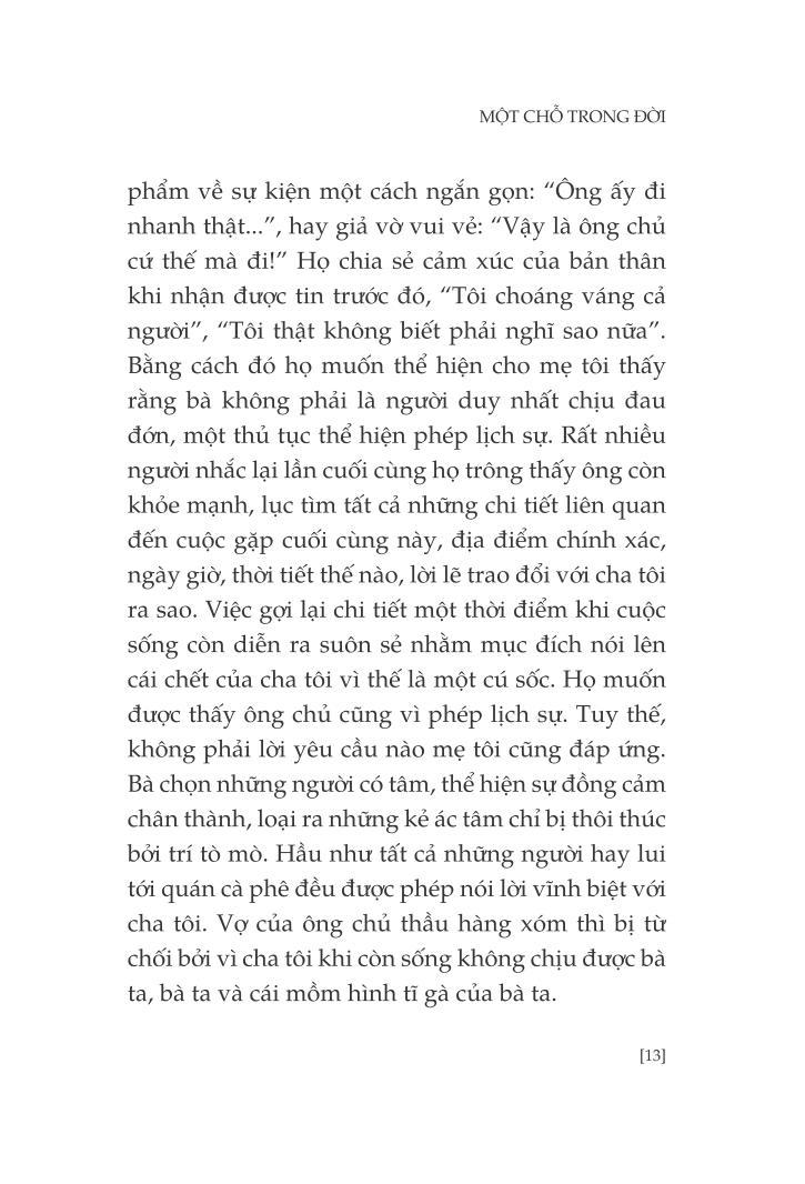 Một chỗ trong đời là câu chuyện về cuộc đời người cha ấy, được kể lại dưới ngòi bút của cô con gái, một cách lạnh lùng nhất có thể, với lối viết hờ hững, không cảm xúc, như những gì xảy đến tự nhiên. Chính lối viết tưởng như giản dị ấy đã mang lại cho Annie Ernaux giải Renaudot năm 1984.