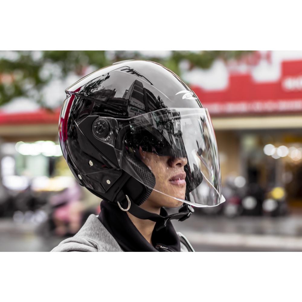 THIẾT KẾ THÔNG MINH - Phong cách thiết kế: mũ kiểu 3/4 kèm kính dài, mũ được thiết kế dáng tròn, đi kèm 2 miếng ốp má, giúp tăng thêm hiệu quả bao phủ, bảo