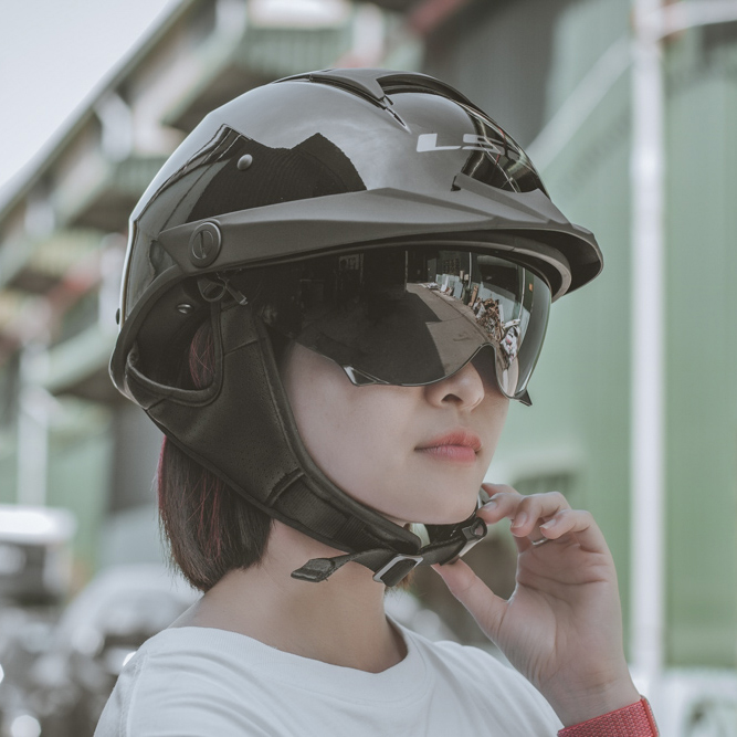 Mũ LS2 OF590 có thể nâng cấp thêm kính âm màu tối giúp bảo vệ bạn khỏi ánh nắng mặt trời. Kính âm màu tối được thiết kế độc đáo với 2 nấc kính ổn định: nấc thứ nhất ở độ khoảng 1/2 kính, hoặc nấc thứ 2 kéo hết kính xuống, vừa phù hợp với từng độ dài khuôn mặt, vừa che chắn theo nhiều mức khác nhau. Phần mút xốp EPS đạt chuẩn DOT.