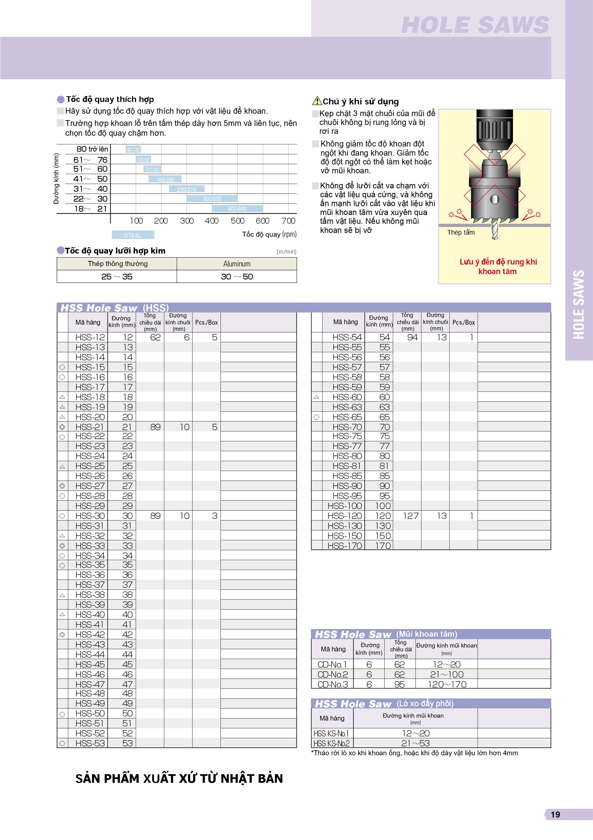 SỬ DỤNG: TẤM THÉP ( đến 3.2 mm), ALUMINUM ( đến 3.2 mm), GỖ, FRP, PLASTIC. Lò xo đẩy phôi (các size từ 53mm trở xuống có gắn lò xo đẩy phôi) Mũi khoét thép gió HS-S là gì? Là mũi khoan có cấu trúc lưỡng kim, với lưỡi cắt thép gió thành phần Cobalt được hàn vào các cạnh cắt. Có thể khoan được nhiều loại vật liệu như nhựa PVC hay thép tấm. Cạnh cắt thép gió HS-S thành phần Cobalt: Mang lại hiệu suất làm việc cao bằng cách hàn lưỡi cắt thép gió HS-S thành phần Cobalt vào thân mũi khoan. Các lưỡi cắt được sắp xếp, giúp cho loại bỏ rung lắc trong lúc khoan