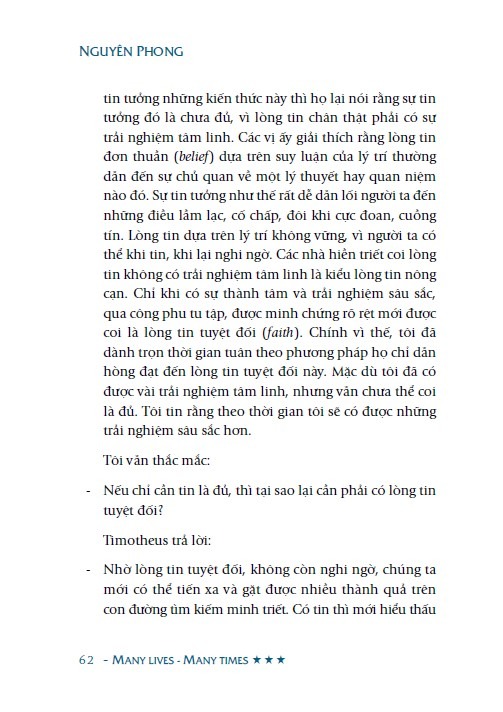 Vẫn bằng giọng văn giản dị và chừng mực, tác giả Nguyên Phong một lần nữa đưa độc giả đi qua các kiếp sống khác nhau, từ Hy Lạp, La Mã, đến Pháp thời trung cổ, rồi quay về nước Mỹ hiện đại. Ở đó, ta được trải nghiệm những hoàn cảnh khác nhau, đồng cảm với nỗi đau của nhân vật và chứng kiến sự trưởng thành của trí tuệ, để lần nữa khẳng định được rằng chính ý nghĩ, lời nói và hành động của chúng ta ở kiếp này sẽ dẫn dắt chúng ta đi về đâu ở kiếp sau. Chẳng có thần linh hay thế lực nào quyết định, chúng ta hoàn toàn chịu trách nhiệm về cuộc đời mình.